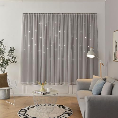 Gyrategirl 2 Panels Self Adhesive Stars Blackout Curtains for Bedroom Double Layer Lace Hollow Stars Window Curtain for Living Room Kids Room Nursery Kitchen