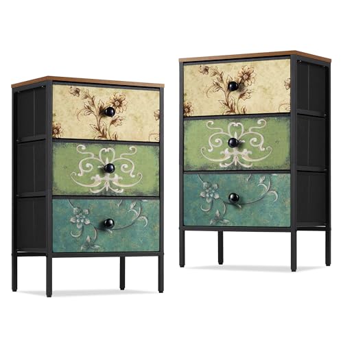 LYNCOHOME Bedside Tables Set of 2,Nightstand with 3 Drawers,Fabric Storage Cabinet Drawers,Furniture Sets for Bedroom,LivingRoom,Nursery,2 Pack