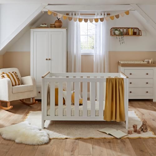 CuddleCo Clara Nursery Furniture in White & Ash | Convertible Baby Cot Bed, Baby Changing Table with Drawers and Kids Wardrobe Set (3pc)