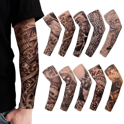 TSHAOUN 10 Pieces Fake Temporary Cool Tattoo Sleeves, Art Arm Fake Tattoo Sleeves Cover For Men Women, Nylon Elastic Arm Stockings Halloween Festivals Tattoo Hip Hop Sun Block Sleeves