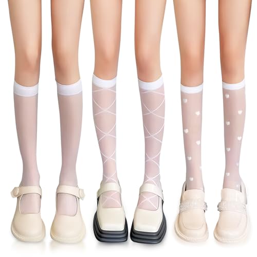 wlertcop 3 Pairs Knee High Socks - White Elastic Printing Knee High Stockings, Nylon Women Pop Socks, Breathable Calf-Length Stockings, Knee Length Sheer Socks Cute for Women Girls