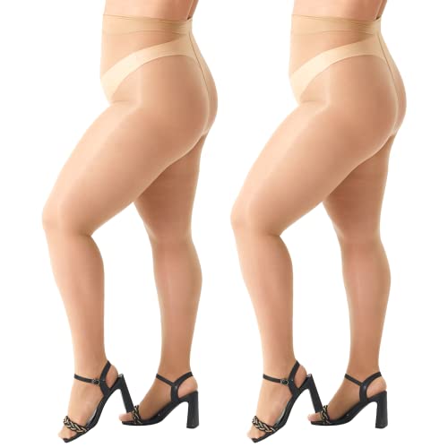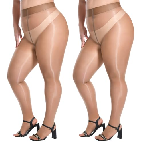 MANZI 2 Pairs Women's Plus Size Shiny Tights Oil Shimmer Sheer Pantyhose High Waist Nylon Stockings(Natural,XXXL-XXXXL)