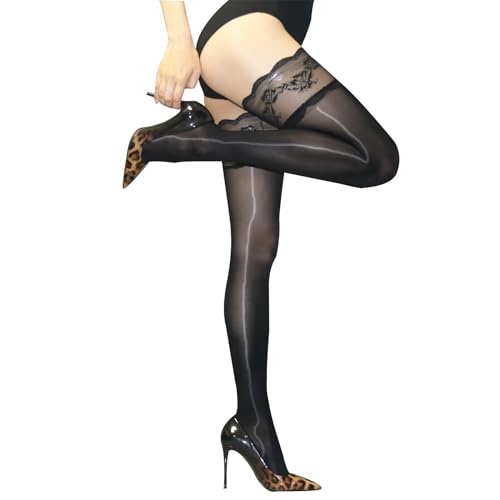 HTRUIYATY Women's Oily Glossy Thigh High Stockings Shiny Hold Ups Stockings 8 Denier Sexy Lace Top Stay Up Nylon Sheer Stockings
