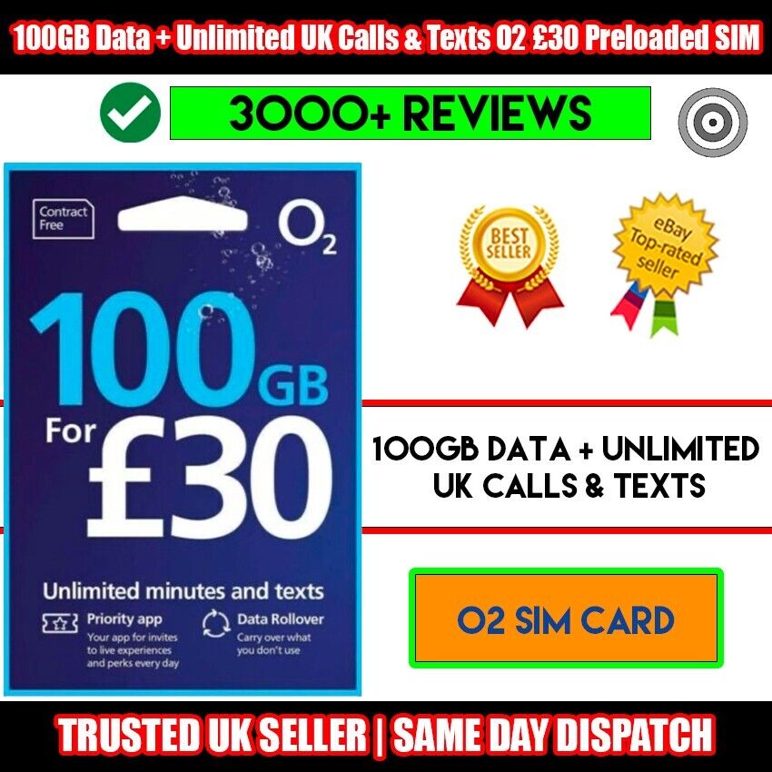 100GB Data + Unlimited UK Calls & Texts O2 £30 Bundle Pay As You Go UK SIM CARD