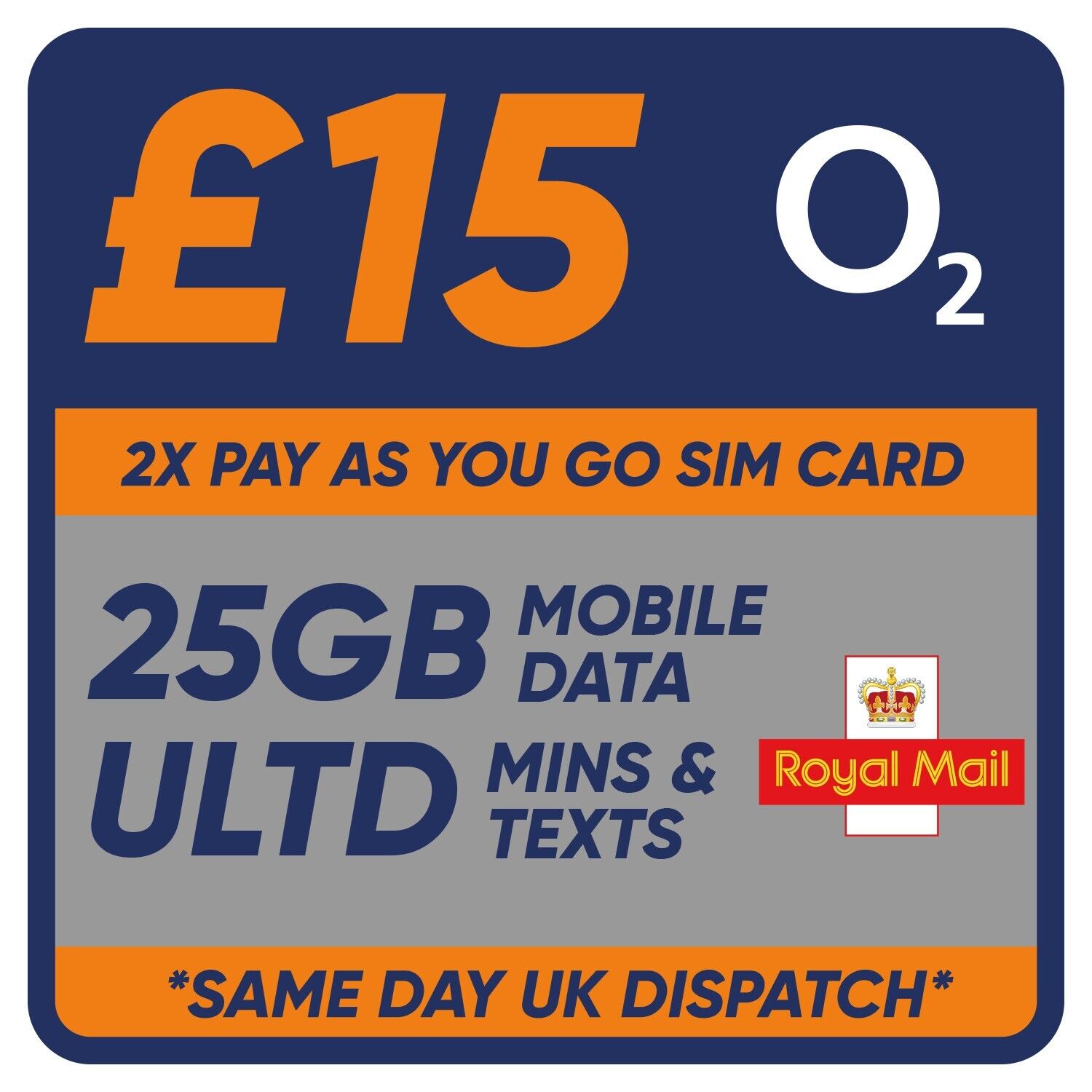 2X NANO O2 PAYG SIM CARD -£15.00 BUNDLE - 25GB DATA, UNLIMITED MINS & TEXTS