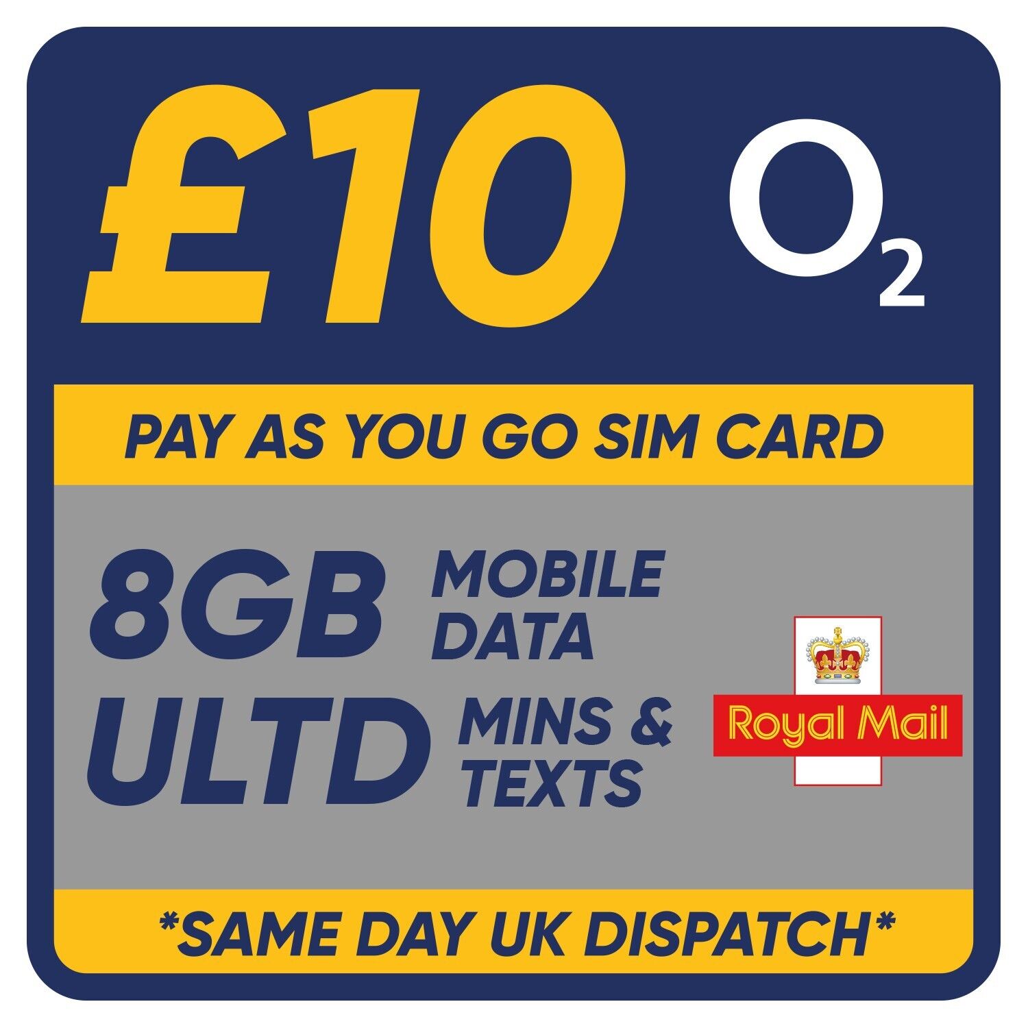10£ 8 GB Data Sim Card Pay As You Go O2 SIM Card Standard Micro & Nano 1st Class