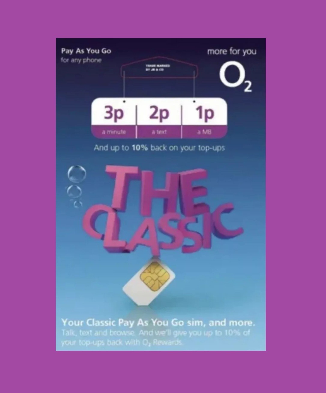 The Classic O2 Pay As You Go SIM card 3p per min, 2p per text 1p per Mb data 02