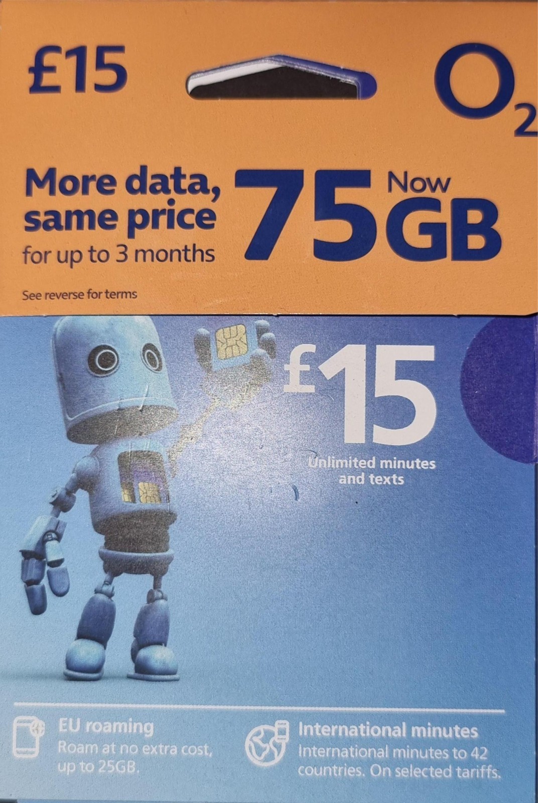 O2 SIM CARD Pay As You Go 75GB UNLIMITED CALLS SMS Standard Micro Nano