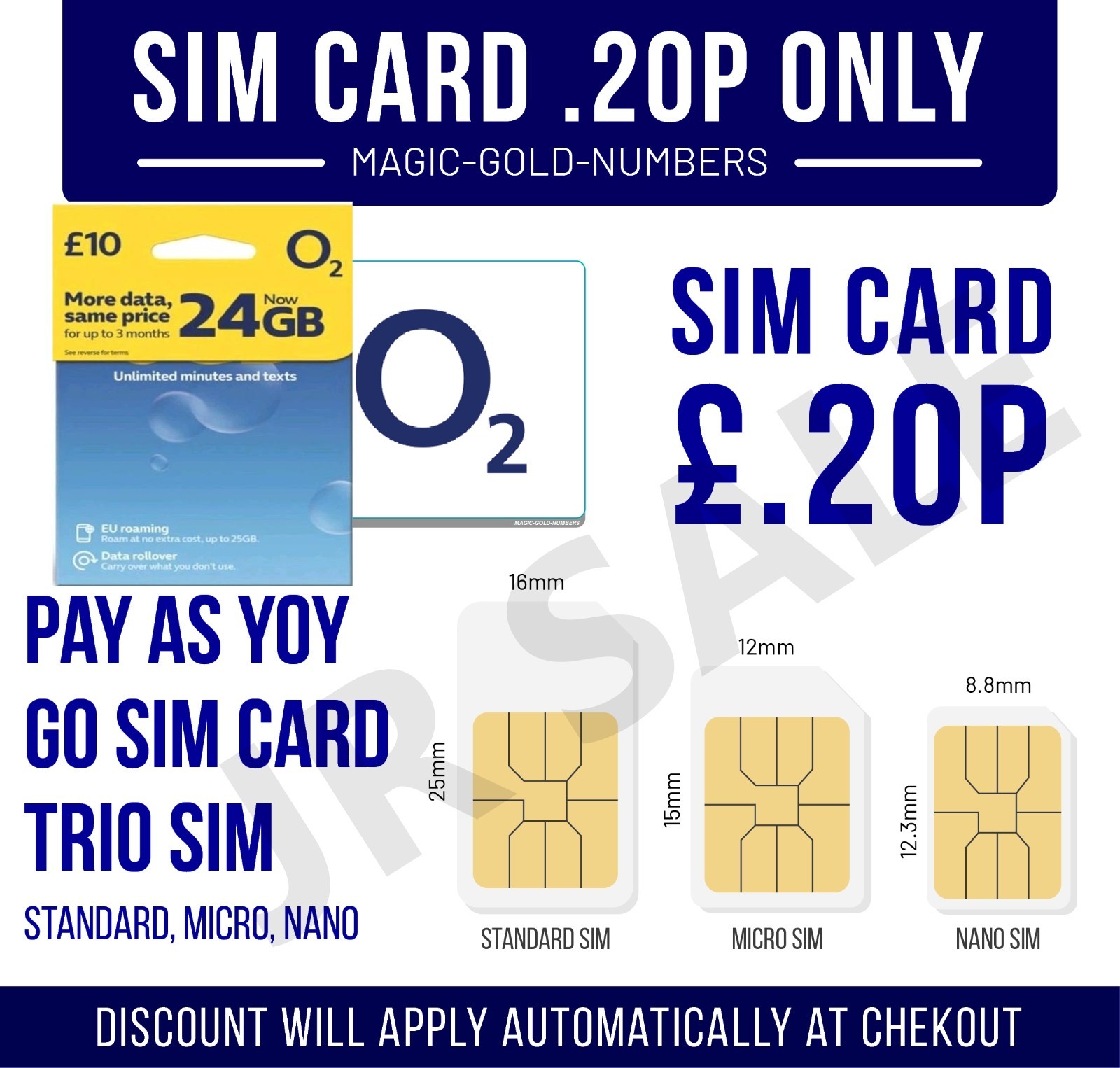 O2 Sim Card PAYG Pay As You Go Tri-Band 2G 3G 4G Standard, Micro & Nano Size