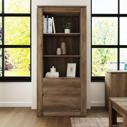 GFW Canyon 2 Drawer Oak Bookcase, Tall Free Standing Book Display Shelving Unit With Storage For Living Room, Dining Room Or Hallway, Oak, W79.2cm x H177.3cm x H39.5cm