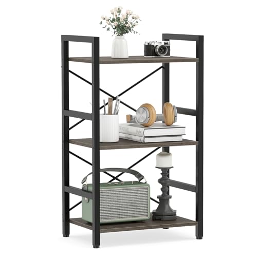 CASART 3/5-Tier Industrial Bookcase, Freestanding Metal Frame Storage Rack Shelving Unit, Display Bookshelf Ladder Shelf Plant Stand for Study Living Room (Grey Oak, 42 x 28 x 71cm)