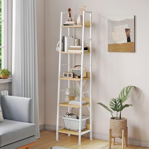 DWVO Narrow Tall Bookcase 5 Tiers, Industrial Ladder Shelf Bookshelf Wooden Shelves and Metal Slim Thin Book Rack Modern Shelving Unit for Living Room, Hallway, Office, White and Oak