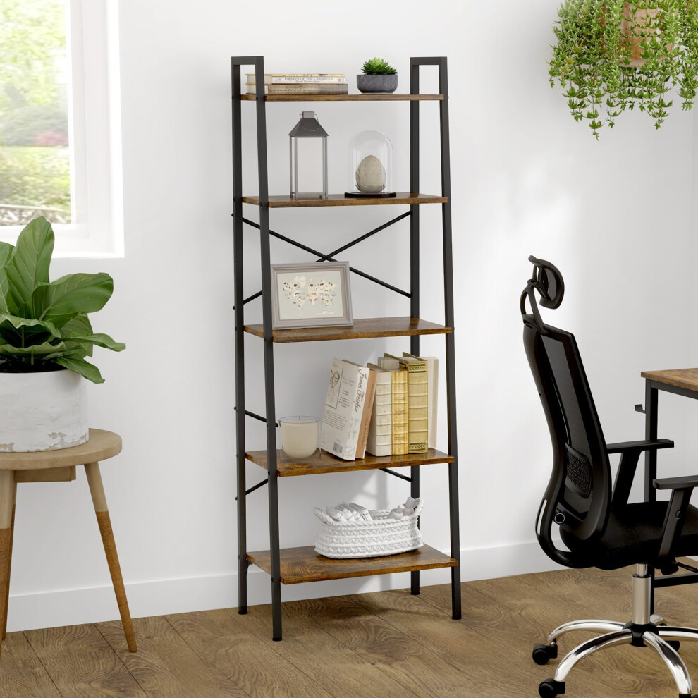 Oak & Tea Ladder Shelf, Ladder Bookcase, 5-Tier Bookshelf, X-Brace Support, 172 cm, Steel Frame, Industrial Style, for Home Office Study Living Room Bedroom, Rustic Brown+Black