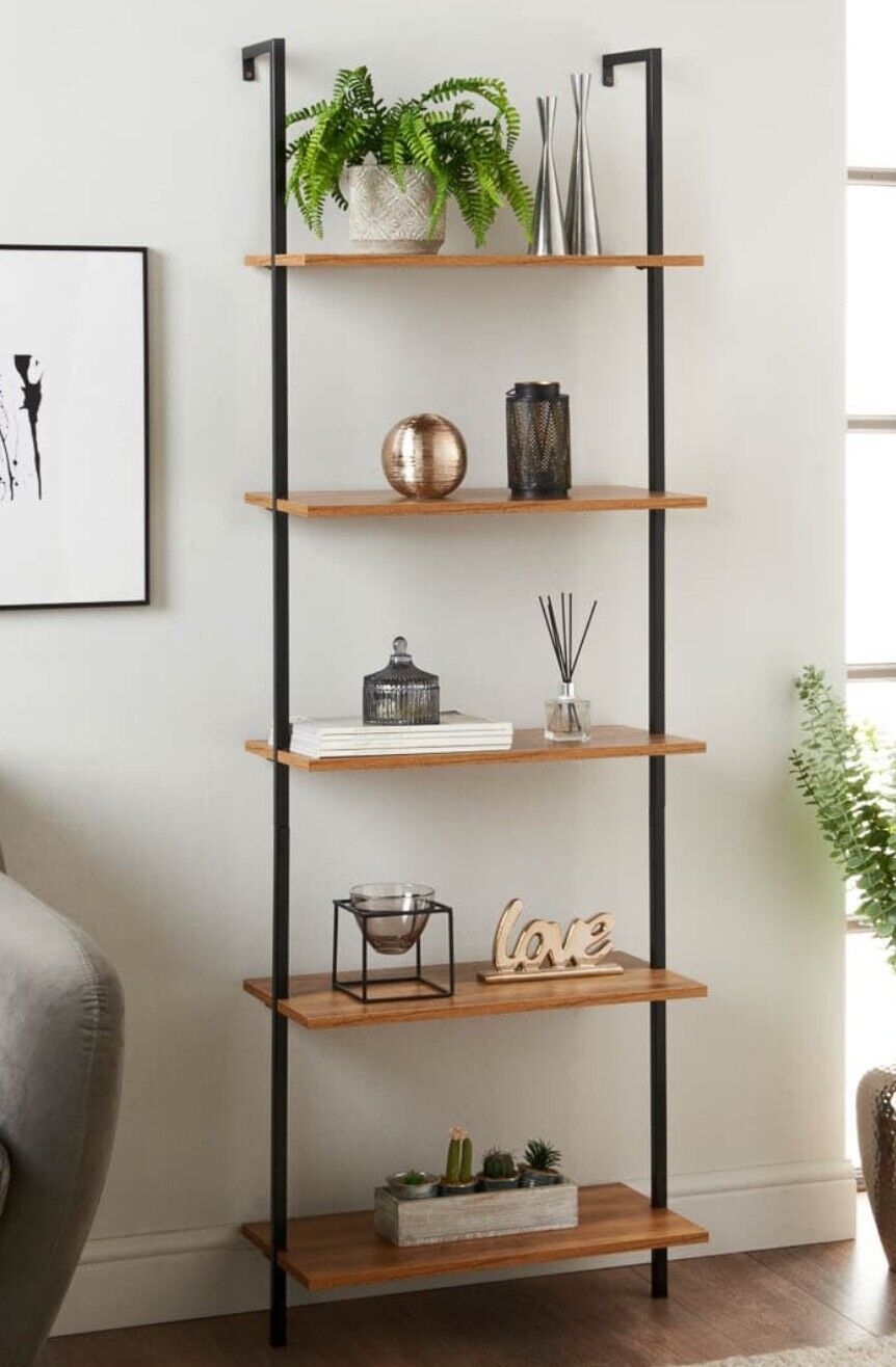 Ladder Bookcase 5 Tier Leaning Display Shelving Unit Rack Shelf Oak