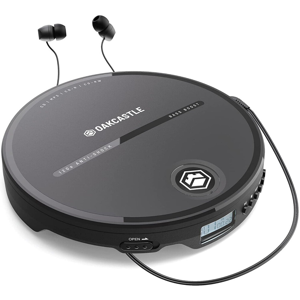 Personal CD Player | Portable Music Player with Included In-Line Control Earphones | 7 Hour Battery Playtime, In-Car AUX Compatibility | Bass Boost, Hold Lock and Anti-Skip Function | OAKCASTLE CD10