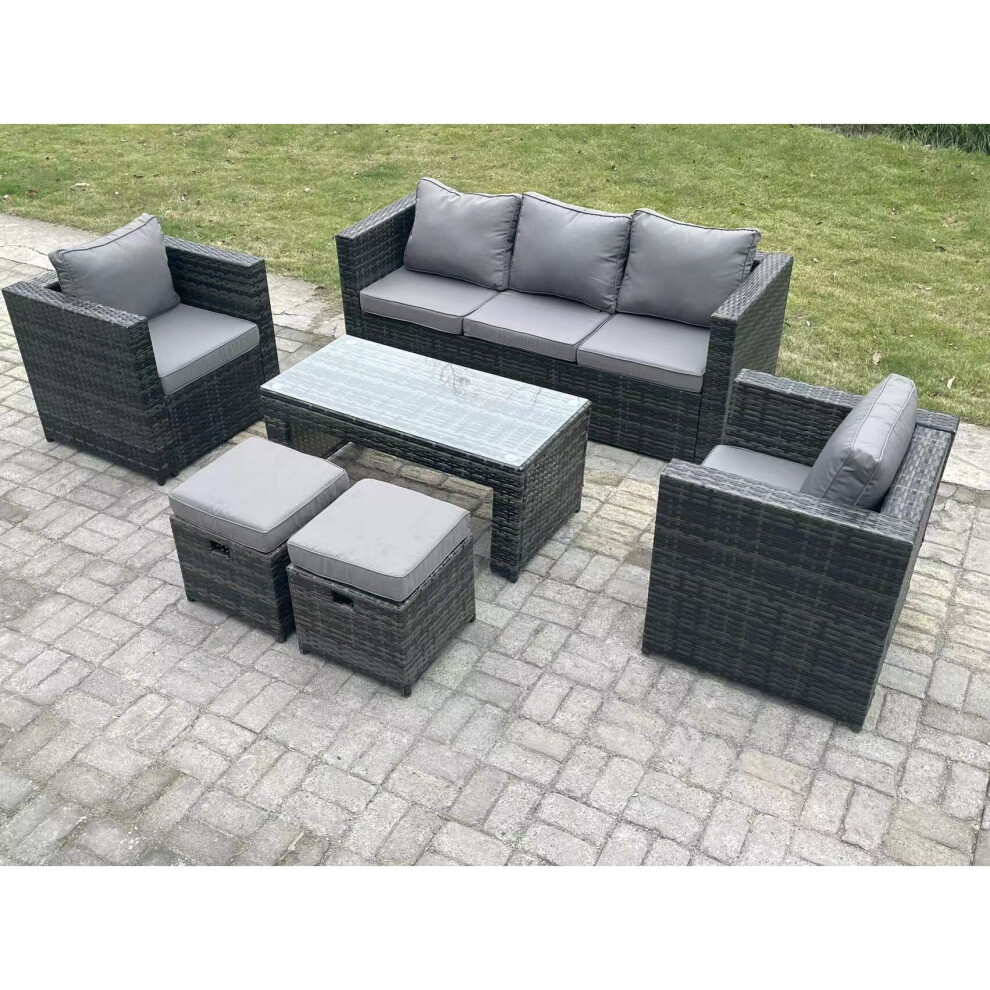 FMSGarden Outdoor Rattan Oblong Coffee Table Corner Sofa Sets Garden Furniture Set with 2 Chairs 2 Small Stools Dark Grey Mixed