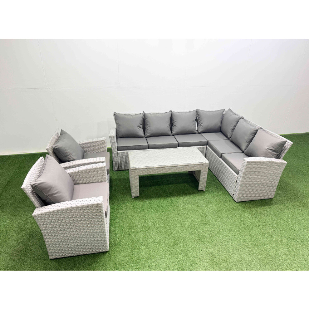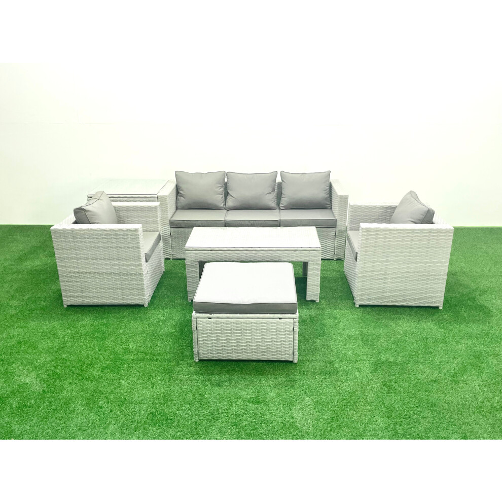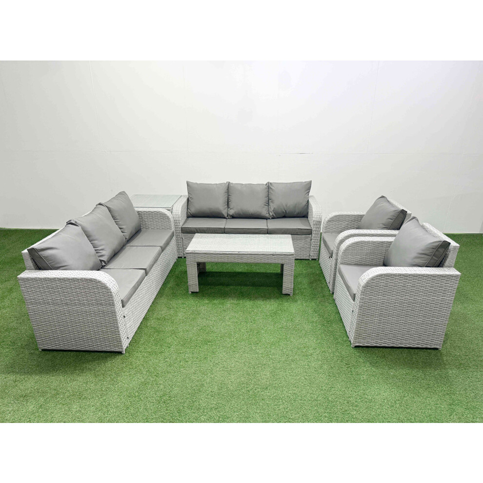 Fimous Rattan Garden Furniture Set 7 Seater Outdoor Garden Sofa 2 Chairs Oblong Coffee Table Set with 2 Stools Side Table Light Grey Mixed