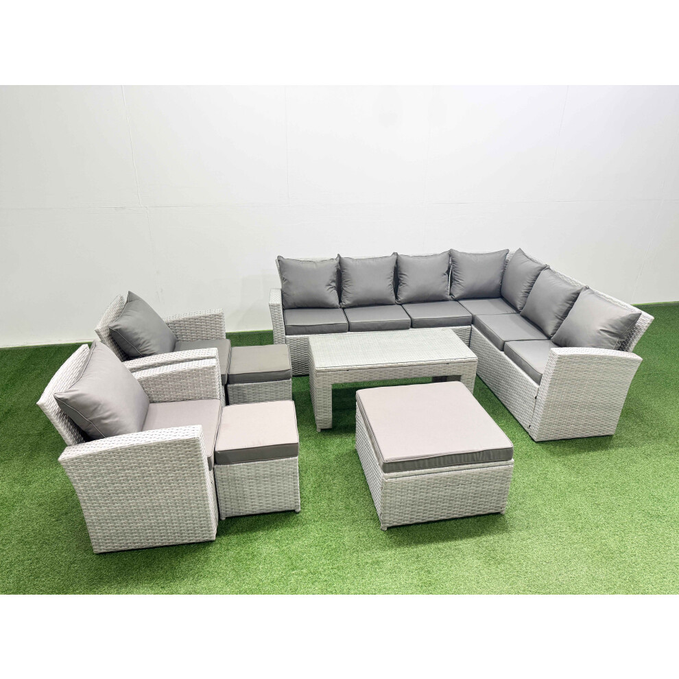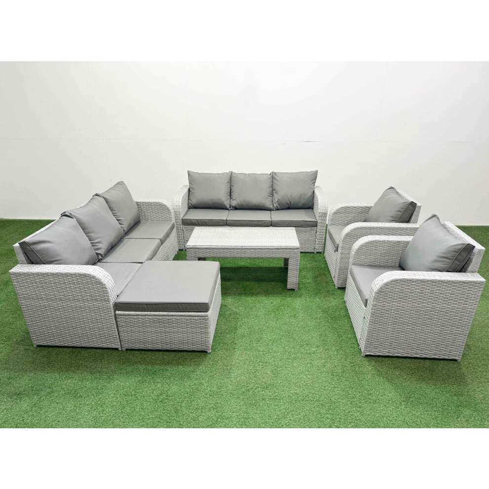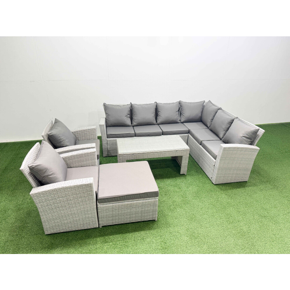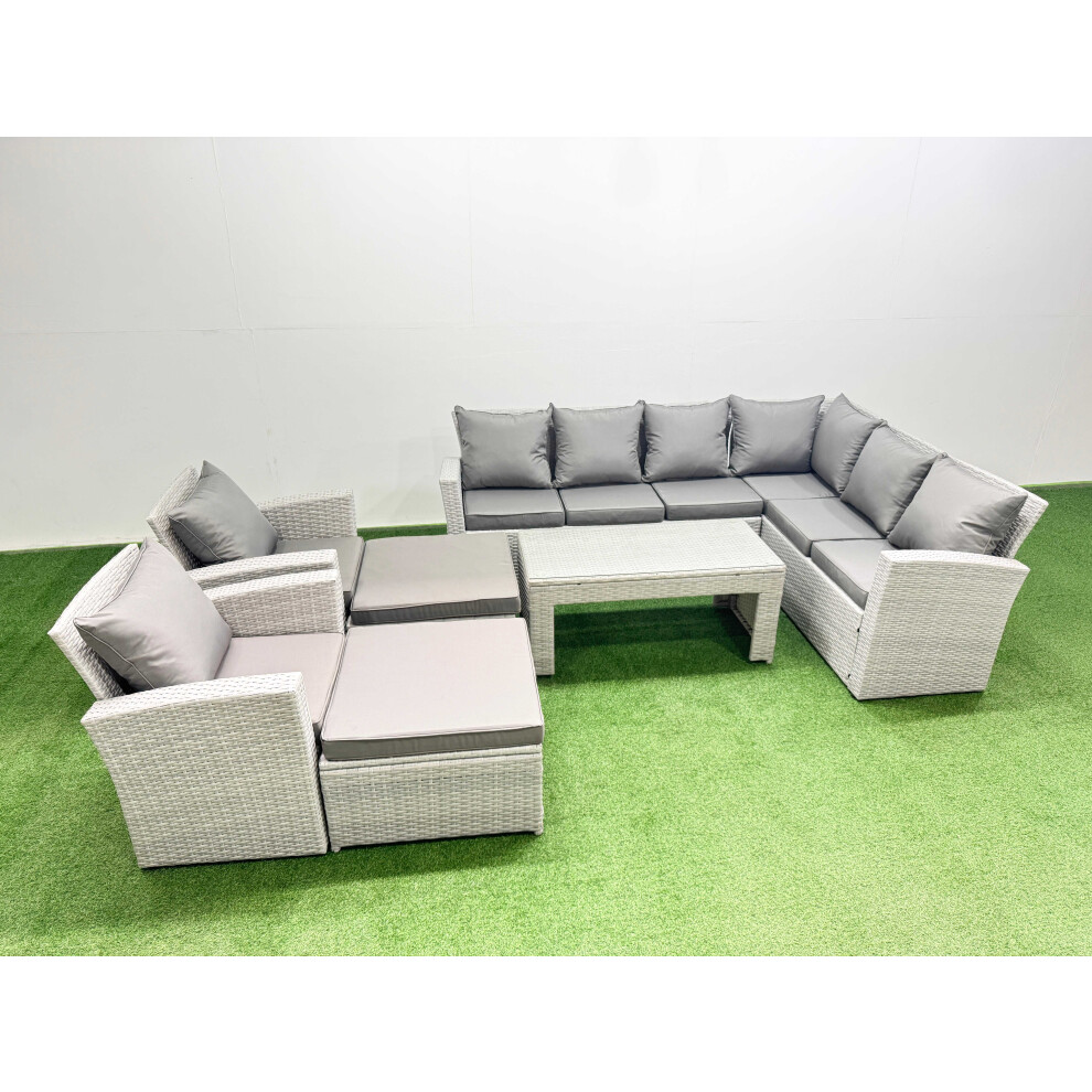 Fimous Rattan Garden Furniture Set 9 Pieces Outdoor Garden Sofa Oblong Coffee Table Set with 2 Chairs 4 Footstools Light Grey Mixed