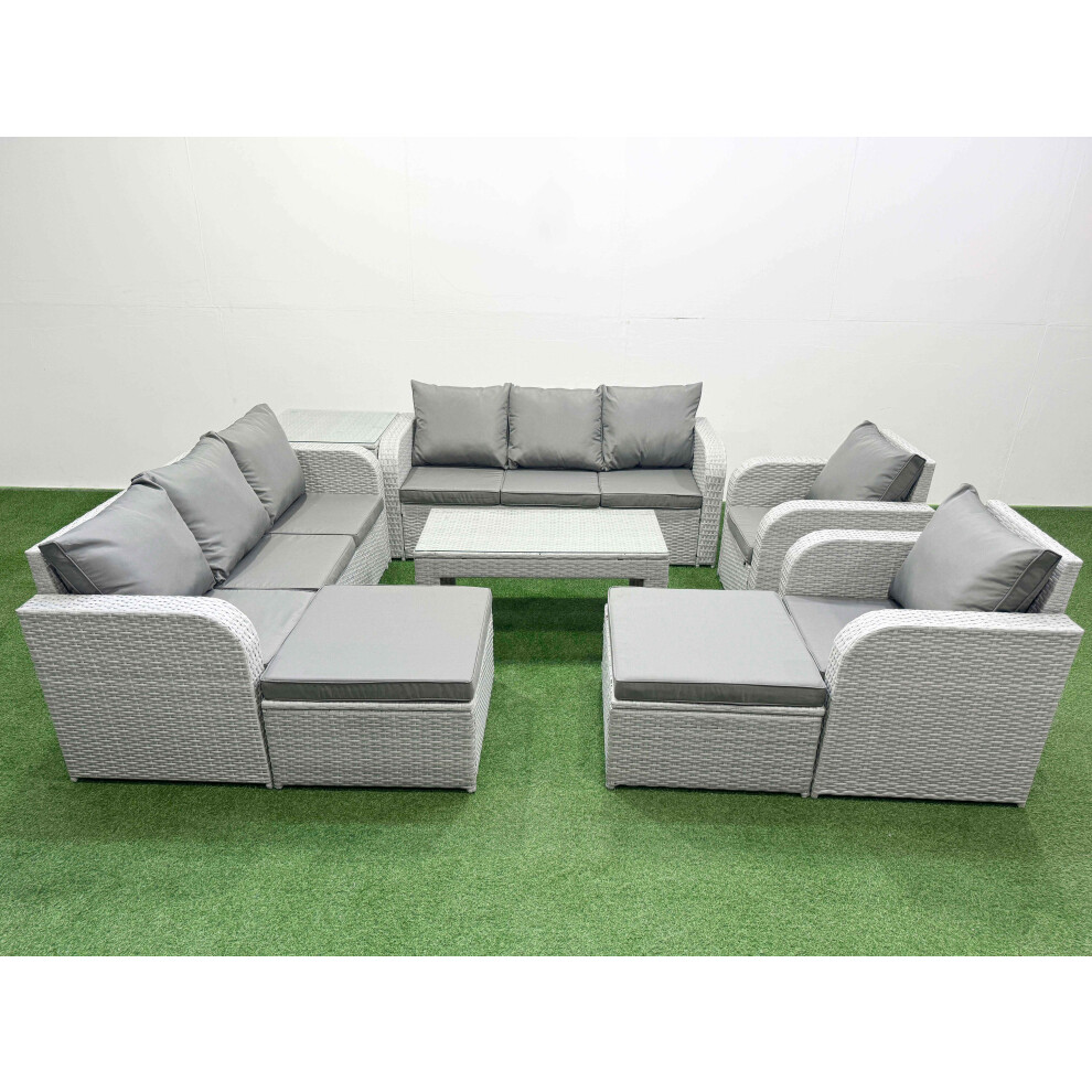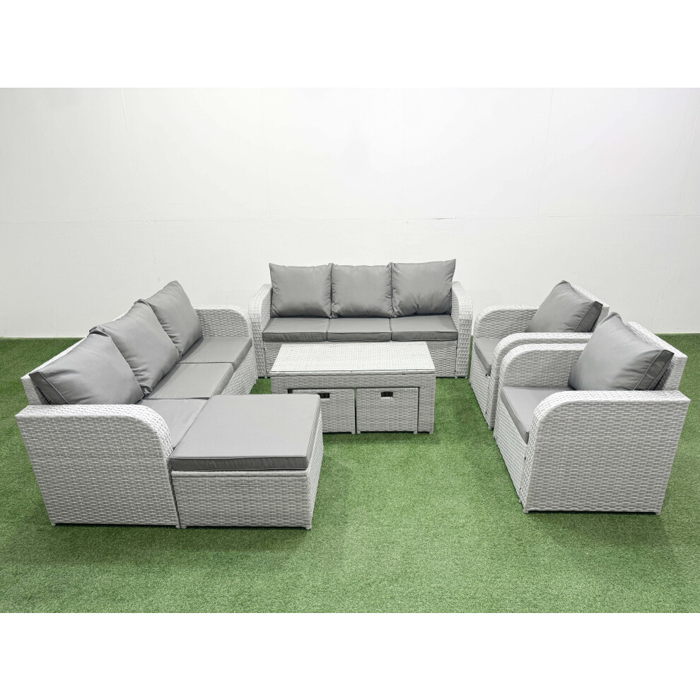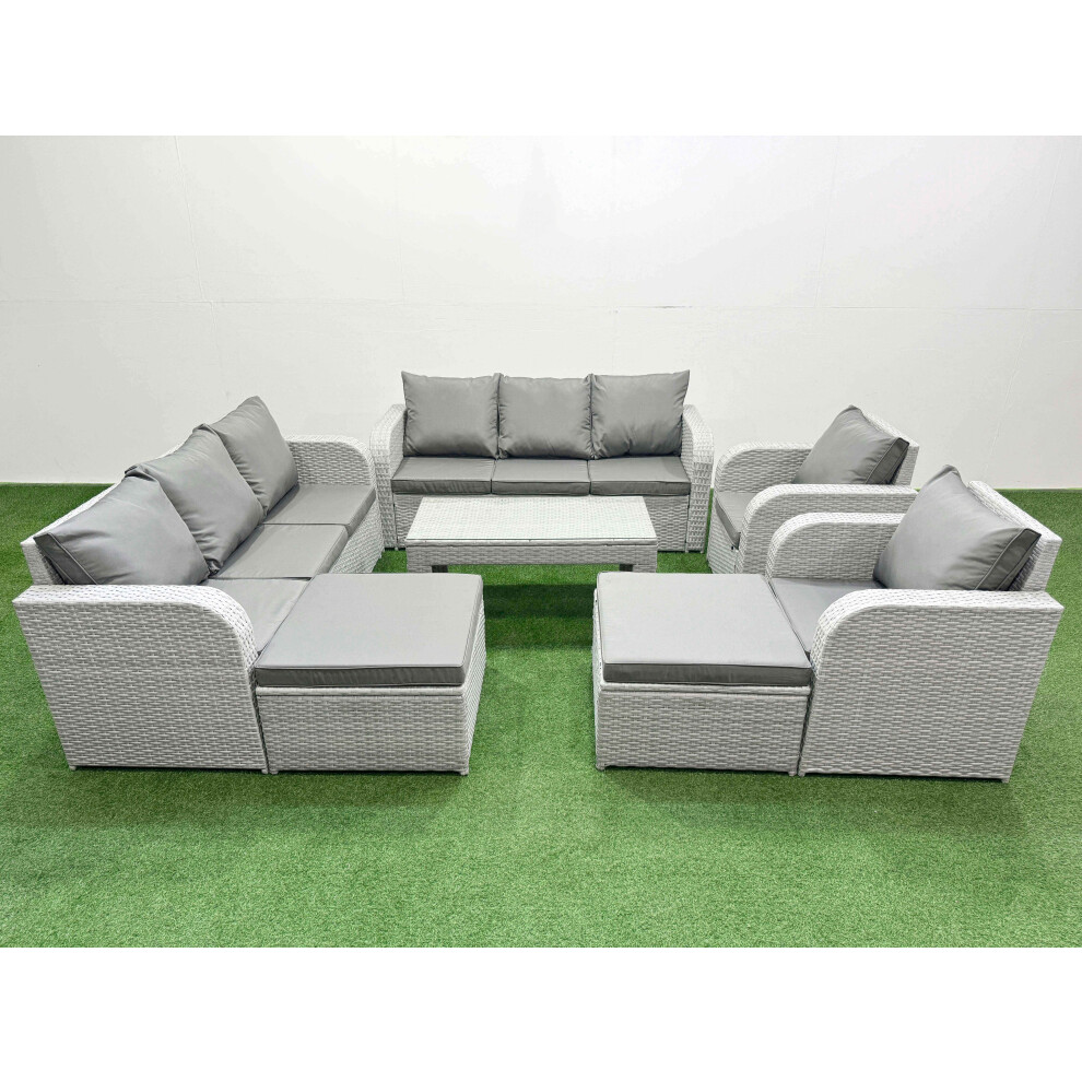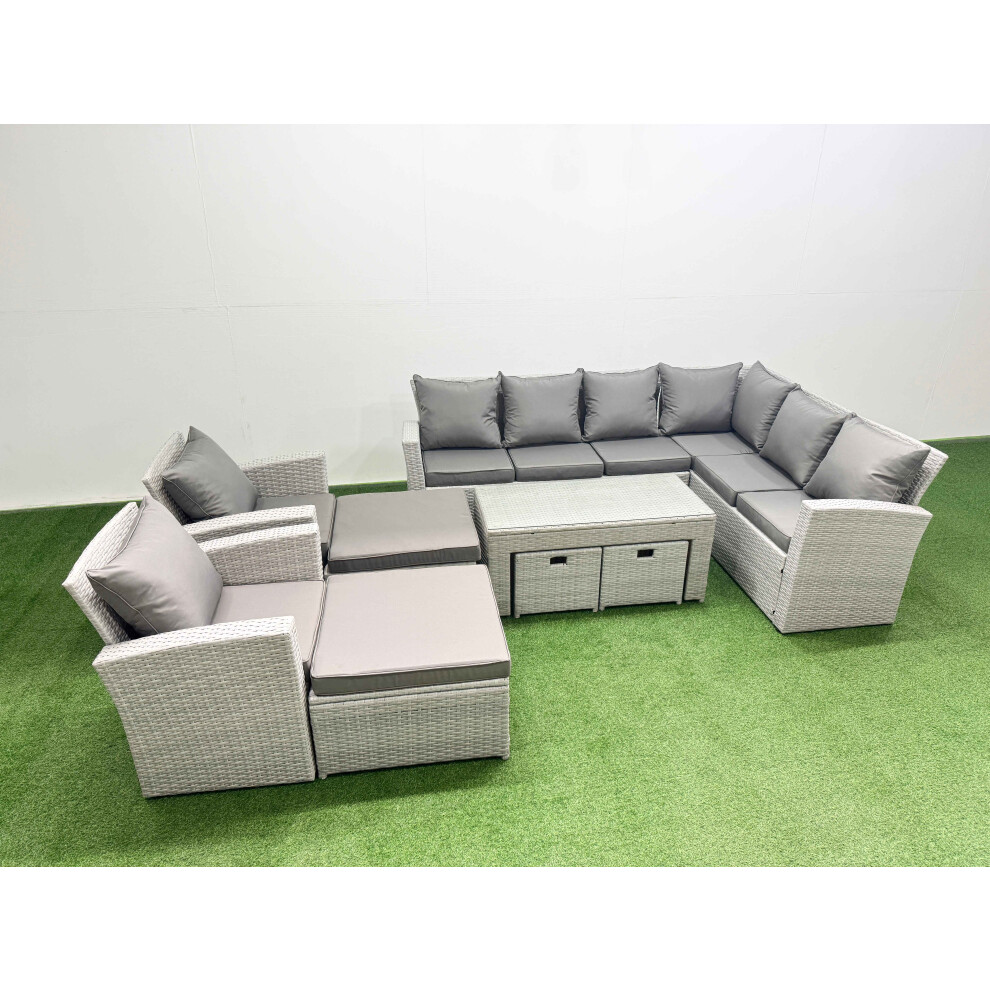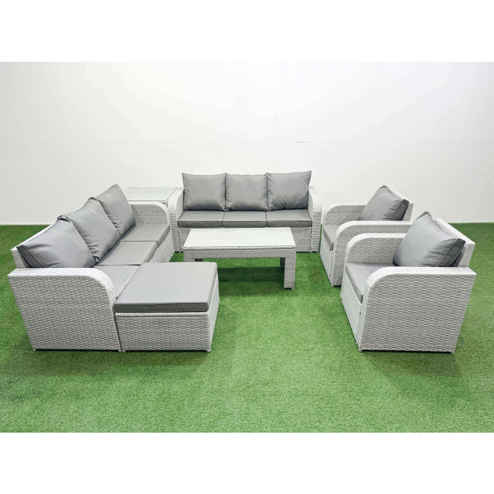 Fimous Rattan Garden Furniture Set 9 Pieces Outdoor Garden Sofa Oblong Coffee Table Set with 2 Chairs 4 Footstools Light Grey Mixed