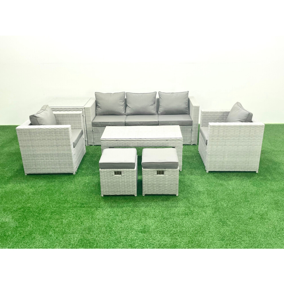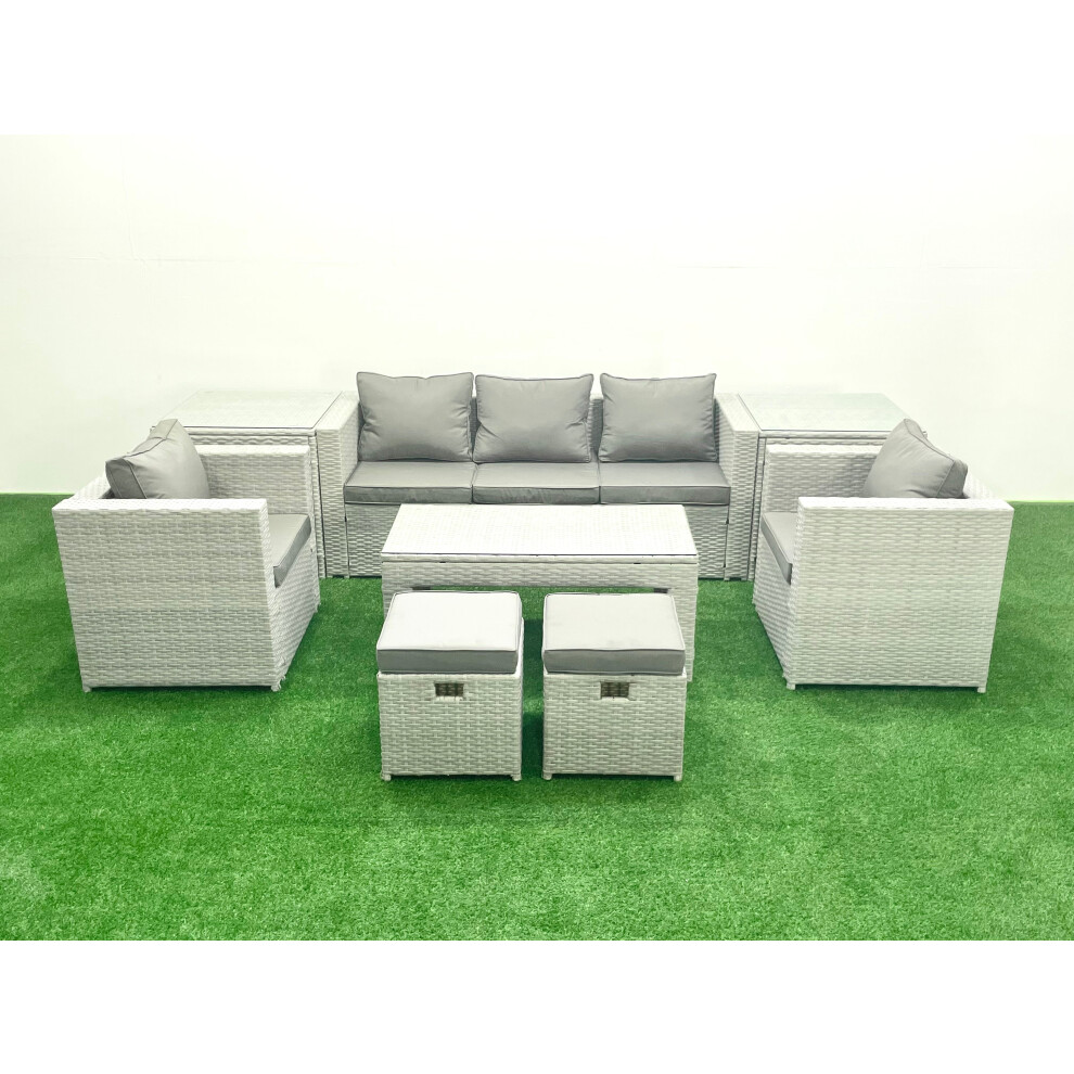 Fimous Rattan Garden Furniture Set 7 Seater Outdoor Garden Sofa Oblong Coffee Table Set with 2 Chairs 2 Stools Side Table Light Grey Mixed