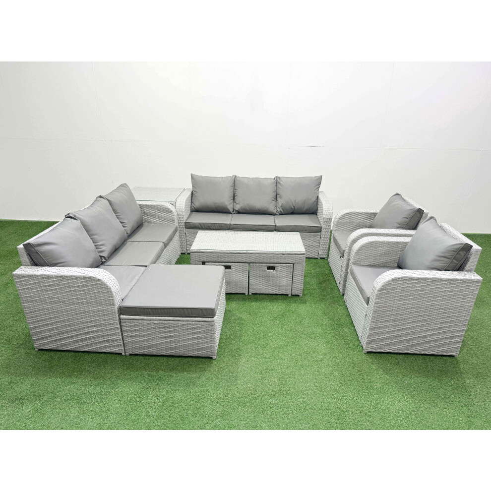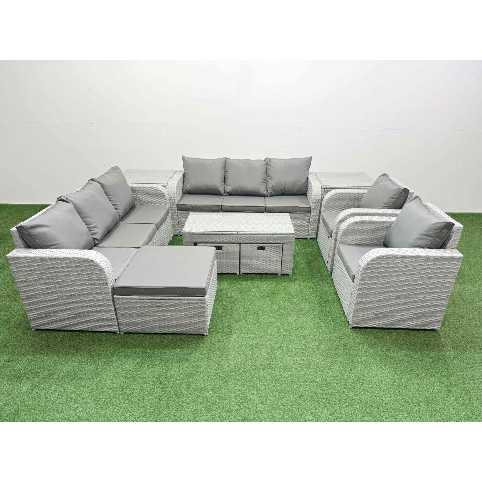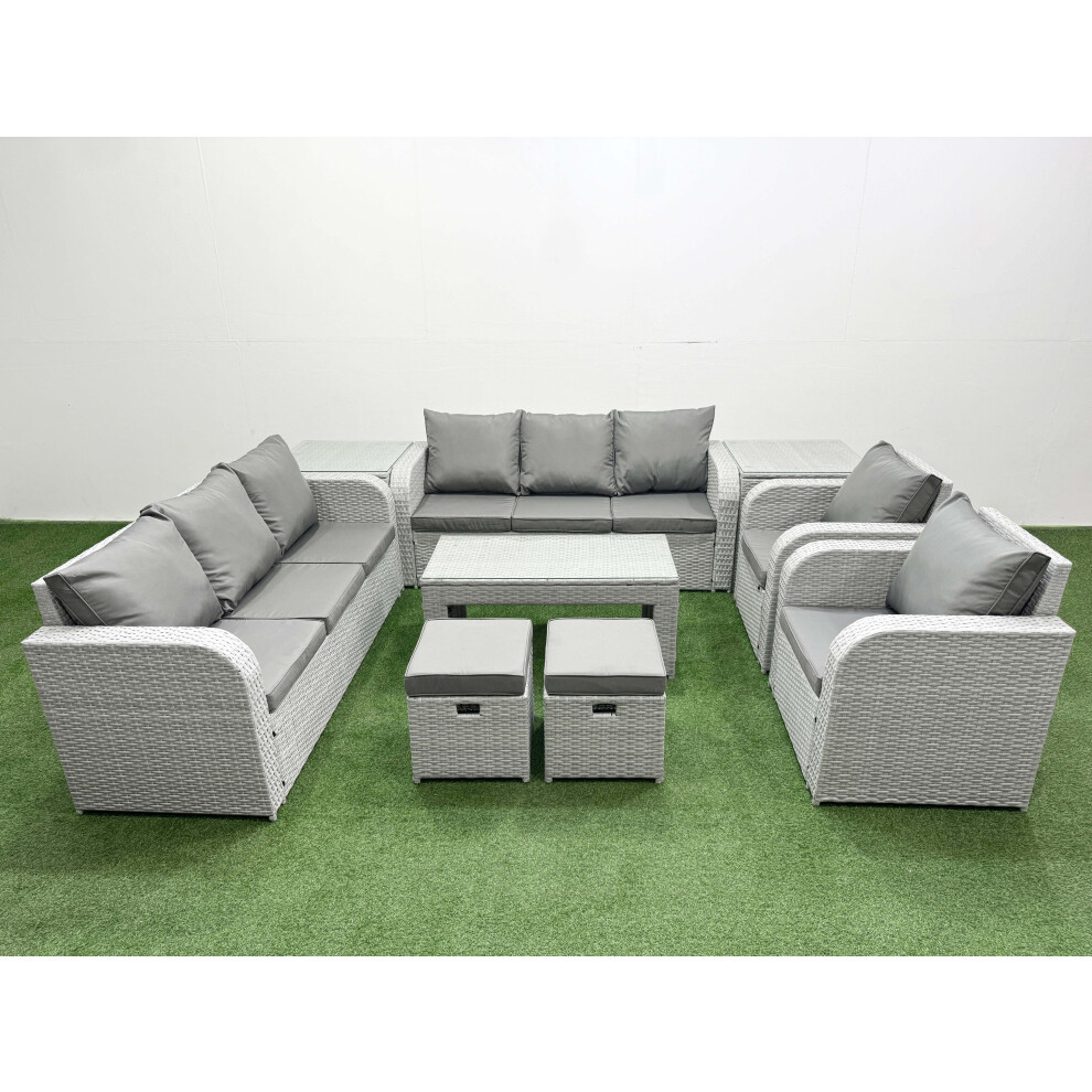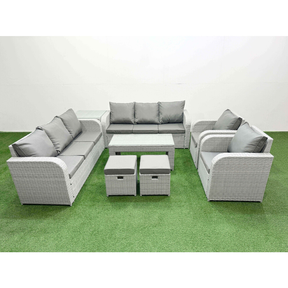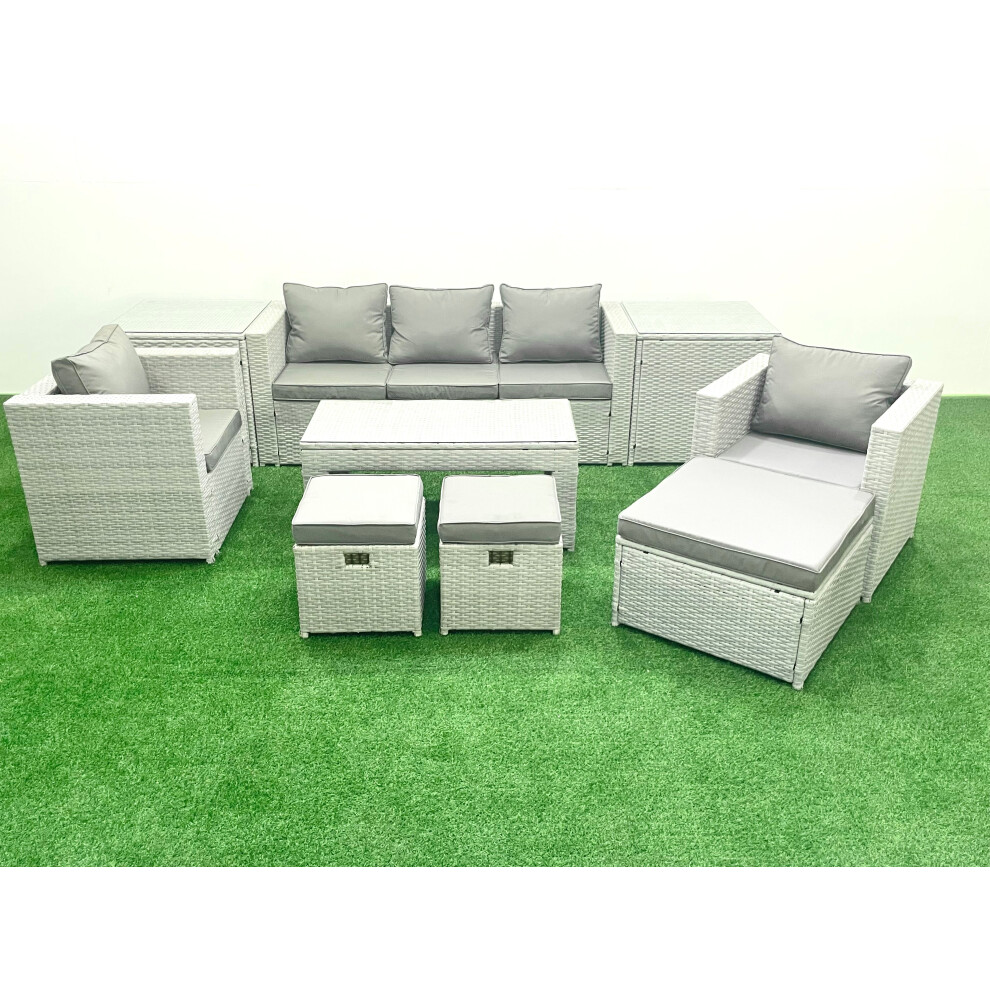 Fimous Rattan Garden Furniture Set 8 Seater Outdoor Garden Sofa Oblong Coffee Table Set with 2 Chairs 3 Stools Side Table Light Grey Mixed