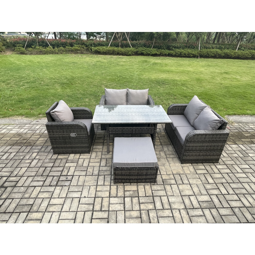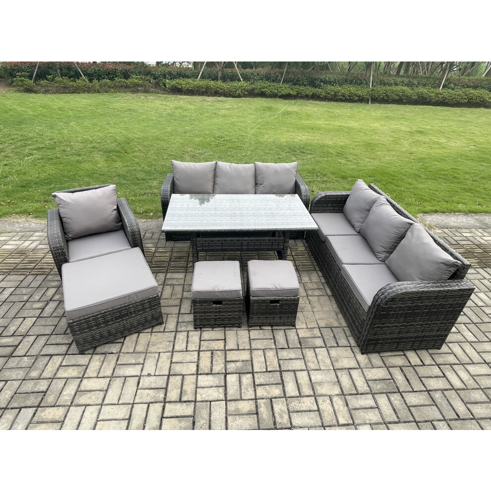 Fimous Lounge Rattan Sofa Set Outdoor Garden Furniture Oblong Rectangular Dining Table With Chairs Big Footstool Dark Grey Mixed