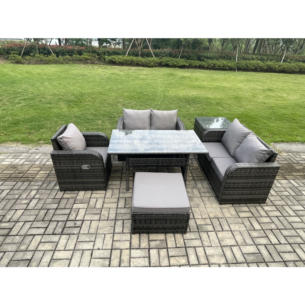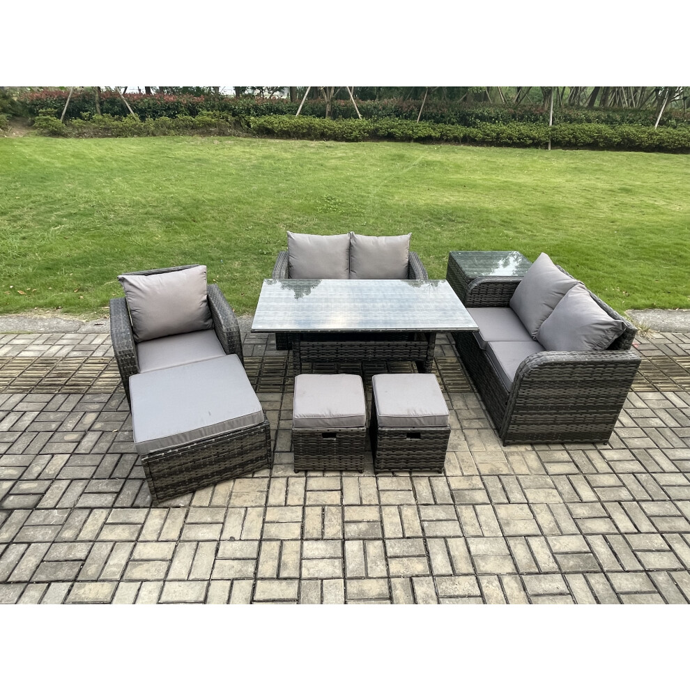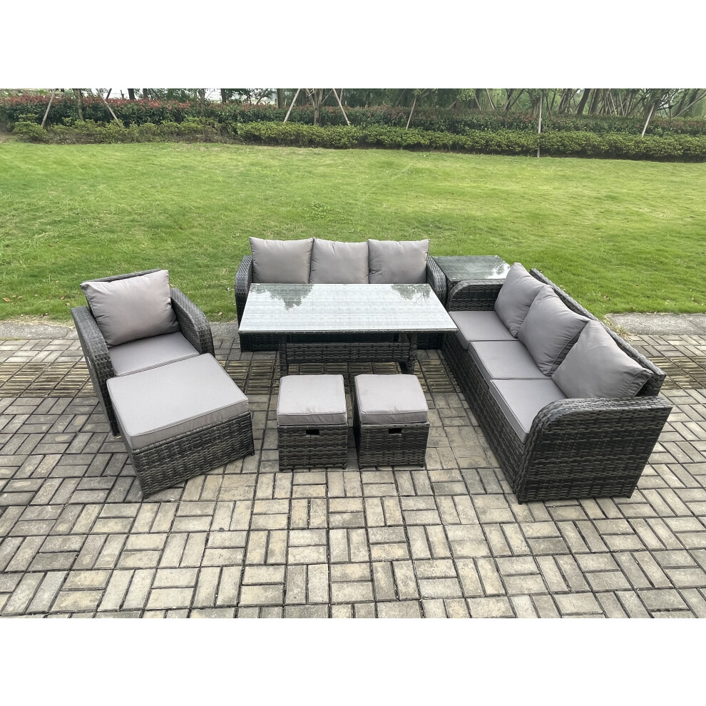 Fimous Lounge Rattan Sofa Set Outdoor Garden Furniture Oblong Rectangular Dining Table With Chairs Big Footstool Side Table Dark Grey Mixed