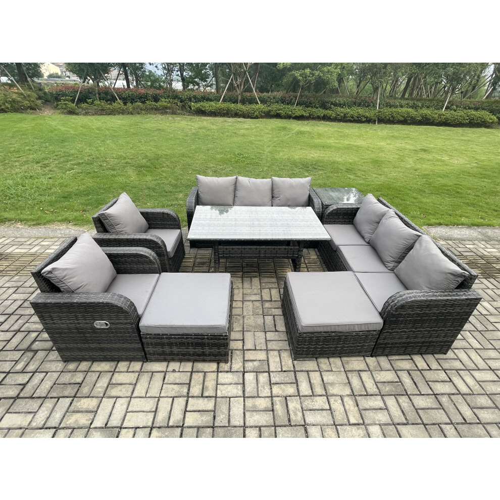 Fimous 8 Seater Rattan Garden Furniture Set Oblong Rectangular Dining Table and Chairs Set with 3 Seater Sofa Big Footstool Dark Grey Mixed