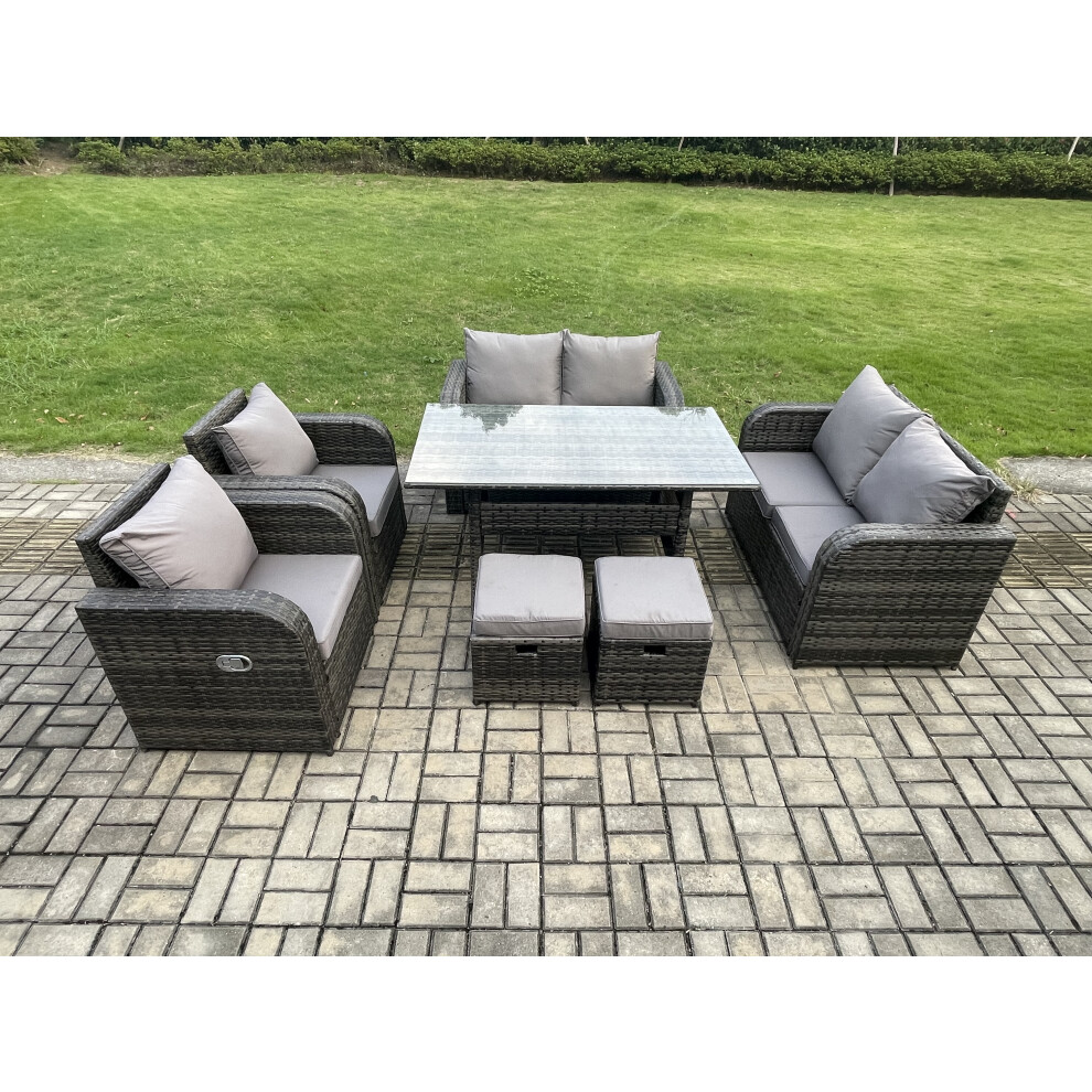 Fimous 7 Seater Lounge Rattan Sofa Set Outdoor Garden Furniture Oblong Rectangular Dining Table With Chairs Footstools Dark Grey Mixed