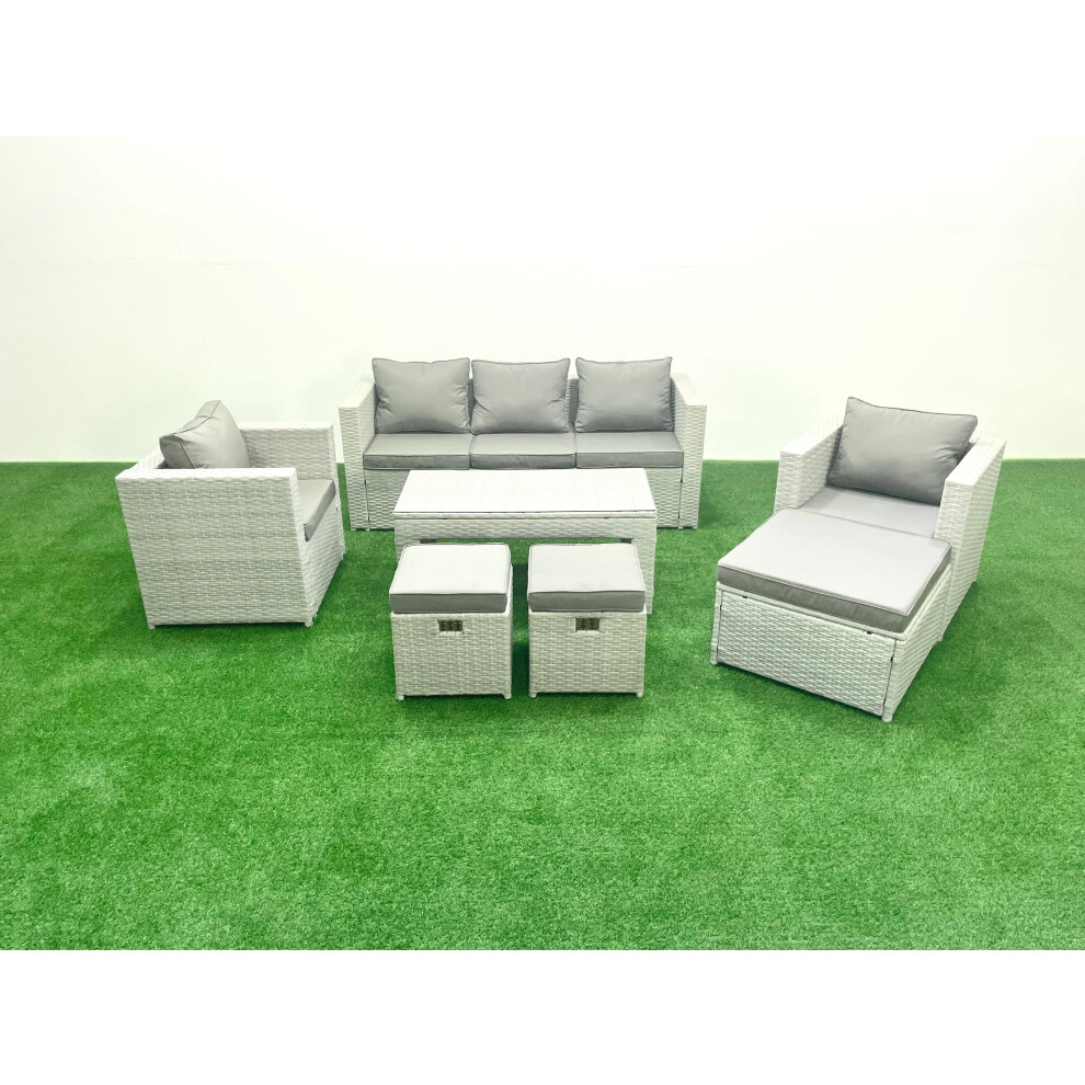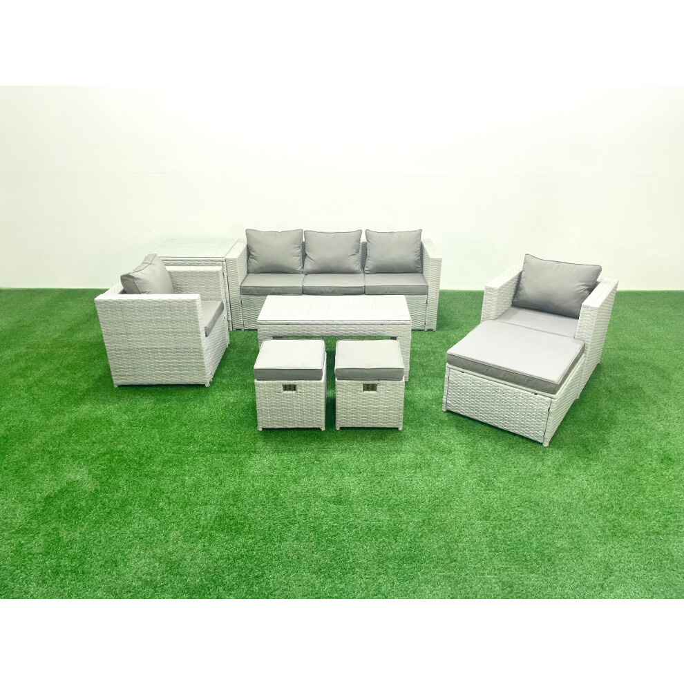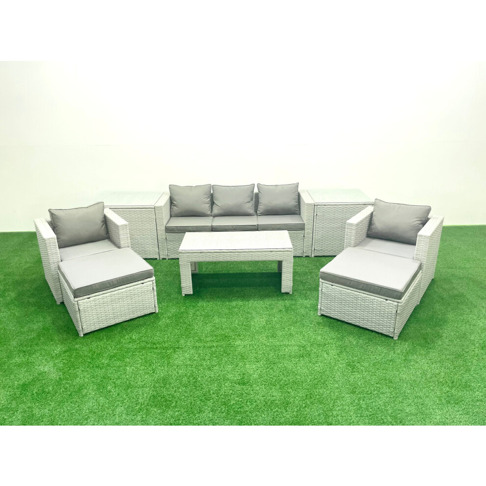 Fimous Rattan Garden Furniture Set 8 Pieces Outdoor Garden Sofa Oblong Coffee Table Set with 2 Chairs 3 Footstools Light Grey Mixed