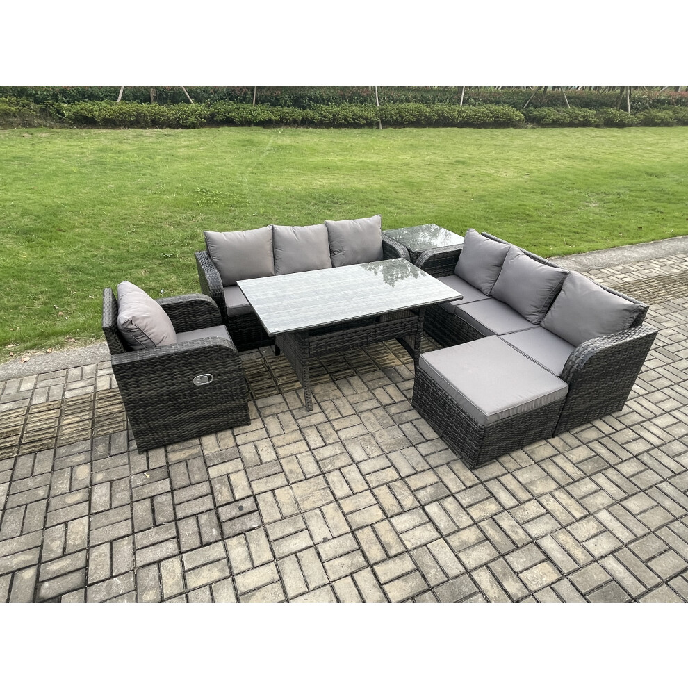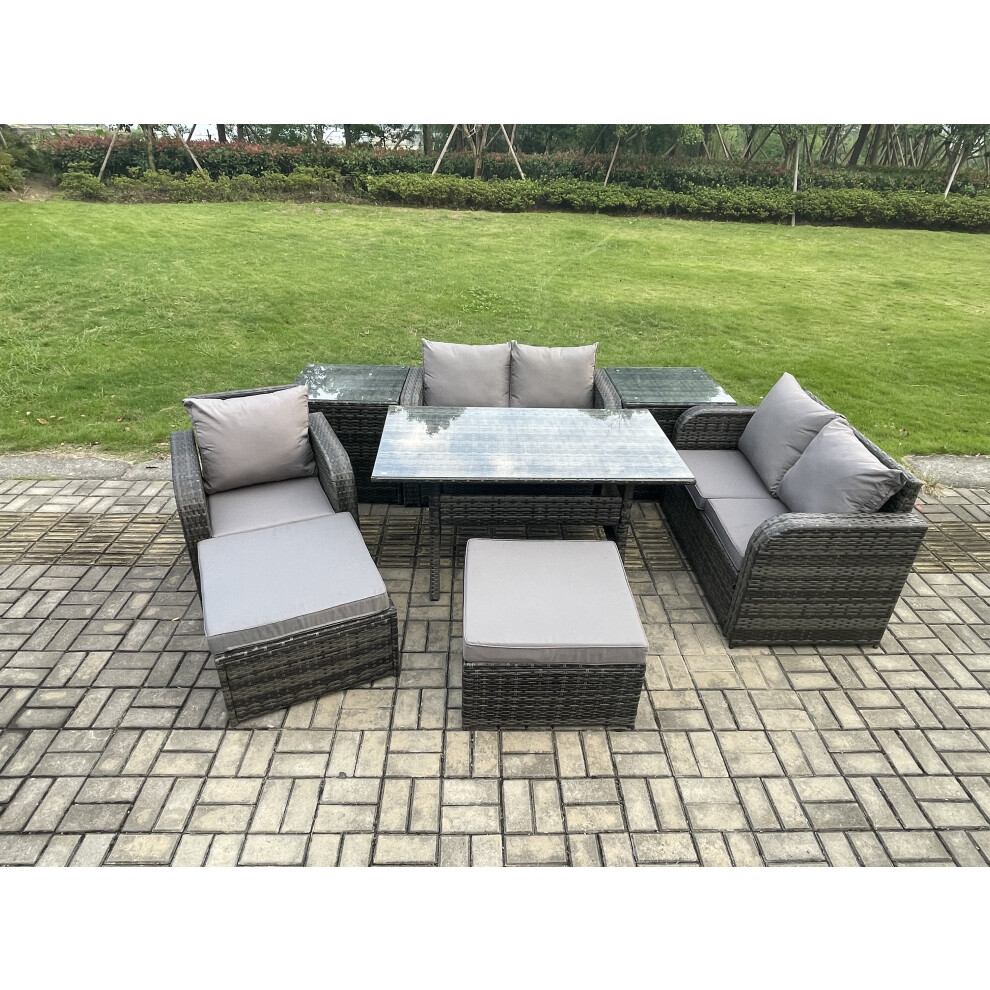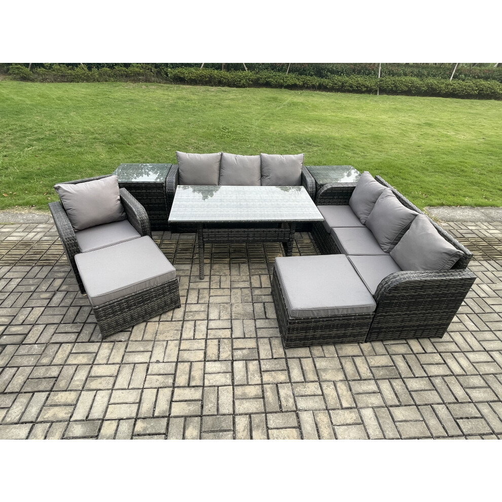Fimous 7 Seater Rattan Garden Furniture Set Oblong Rectangular Dining Table and Chairs Set with 3 Seater Sofa 2 Side Tables Dark Grey Mixed