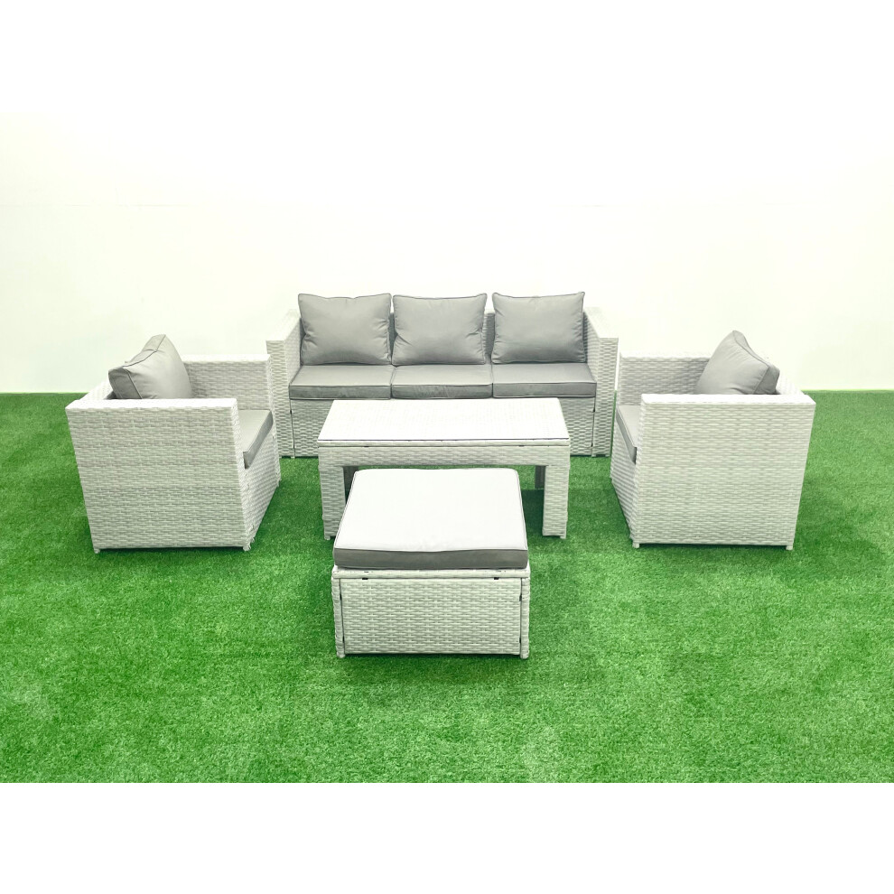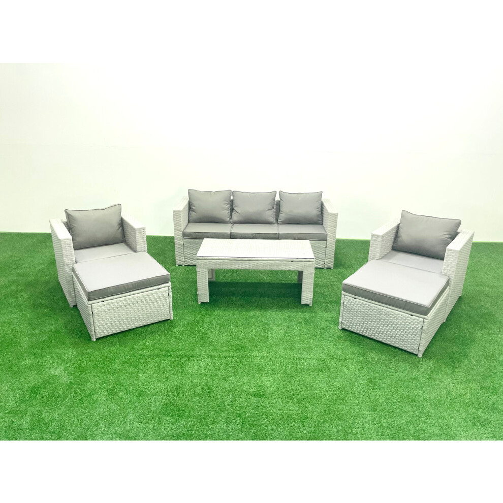 Fimous Rattan Garden Furniture Set 6 Pieces Outdoor Garden Sofa Oblong Coffee Table Set with 2 Chairs Big Footstool Light Grey Mixed