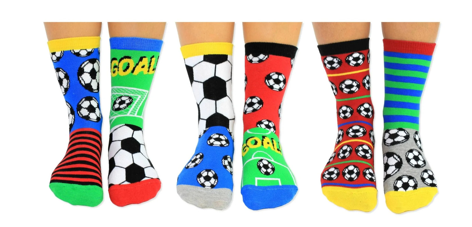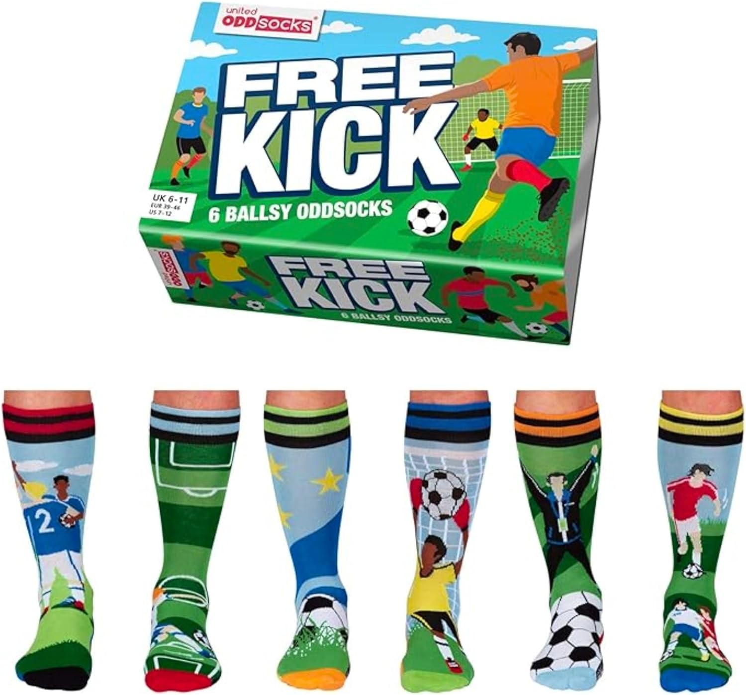 United Oddsocks Free Kick Gift Box – 6 Ballsy Odd Socks for Men – UK 6-11 EUR 39-46 US 7-12 – Football-Themed Novelty Present, Colourful Cotton Rich Crew Socks, Fun Gift for Soccer Fans and Players