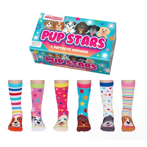 United Oddsocks Pup Stars Gift Box – 6 Pup-Tastic Girls' Odd Socks for Kids– UK 12–5.5, EUR 30.5–38.5, US 13.5–8 – Colourful Dog Socks, Fun Novelty Present, Mix & Match Gift Idea for Animal Lovers
