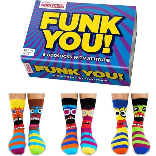 United Oddsocks Funk You Men's Odd Socks Gift Box – 6 Colourful Mismatched Funky Striped Socks with Faces – UK 6–11, EUR 39–46, US 7–12 – Funny Birthday, Bold Novelty Socks for Men, Friends & Family