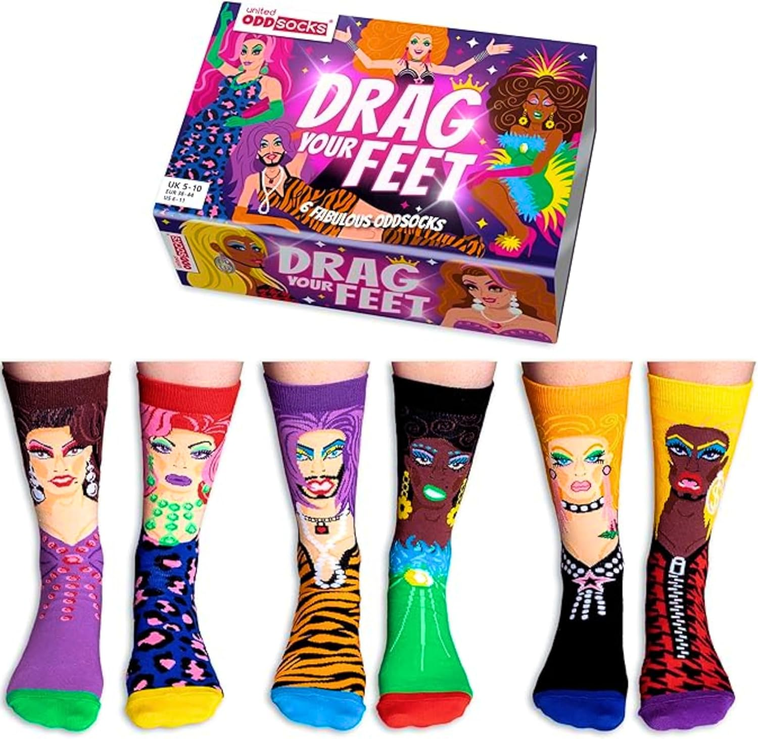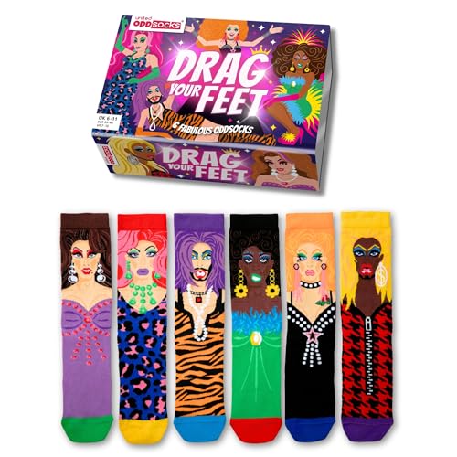 United Oddsocks Drag Your Feet Odd Socks Gift Box – 6 Colourful Mix & Match Socks with Drag Queen Designs, UK 5-10, EUR 38-44, US 6-11, Fun & Unisex Socks for Gifting, Parties, Pride & Self-Expression