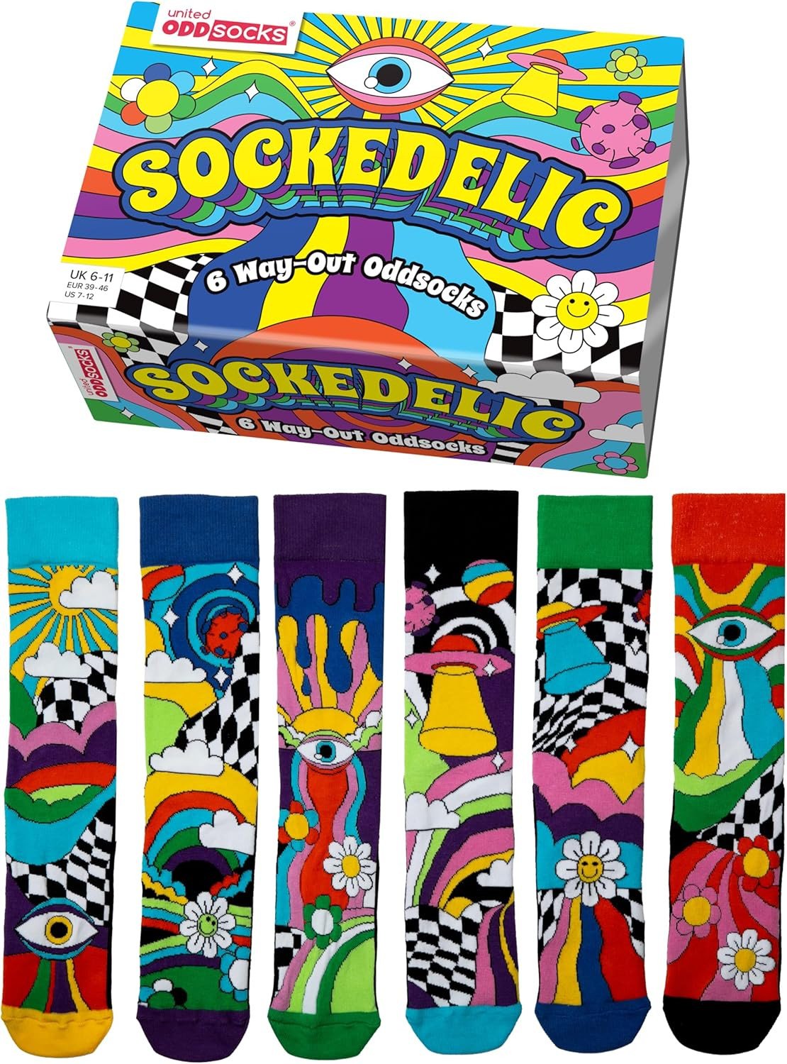United Oddsocks Sockedelic Gift Box – 6 Way-Out Odd Socks for Men – UK 6–11, EUR 39–46, US 7–12 – Colourful Mix & Match Novelty Socks with Psychedelic Patterns – Fun, Funky Gift for Men Who Love Style
