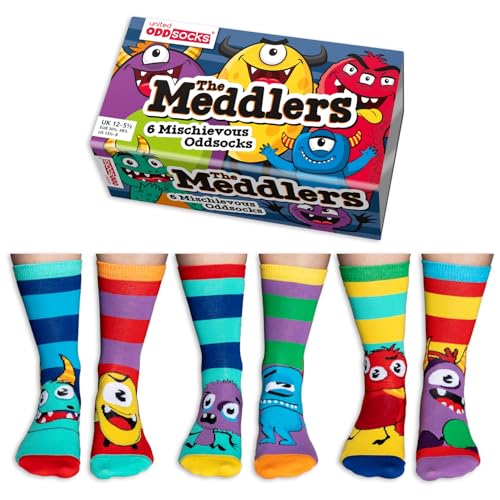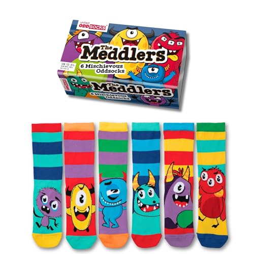 United Oddsocks The Meddlers Gift Box – 6 Mischievous Odd Socks for Kids – UK 12–5.5 EUR 30.5–38.5 US 13.5–8 – Colourful Monster-Themed Novelty Present, Cotton Rich Crew Fit, Fun Back to School Set