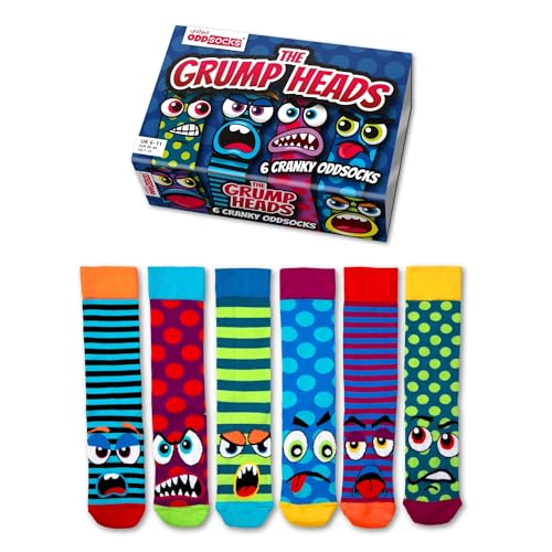 United Oddsocks The Grump Heads Gift Box – 6 Cranky Mix & Match Odd Socks for Men – UK 6–11, EUR 39–46, US 7–12 – Colourful Monster-Themed Novelty Socks – Fun Gift for Birthdays, Christmas & More