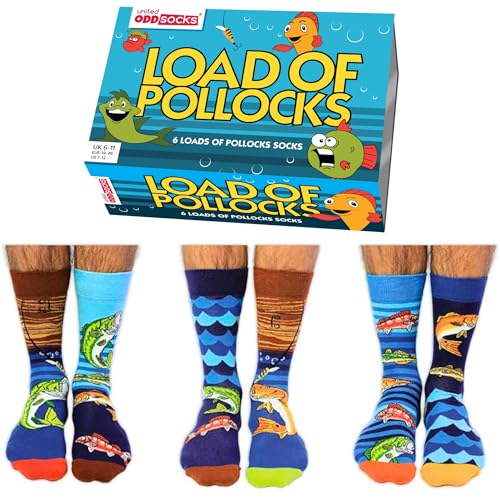 United Oddsocks Load of Pollocks Gift Box – 6 Fish-Themed Mix & Match Odd Socks for Men, UK 6–11, EUR 39–46, US 7–12 – Funny Cotton Socks with Underwater Designs in Gift Packaging, Novelty Sock Set