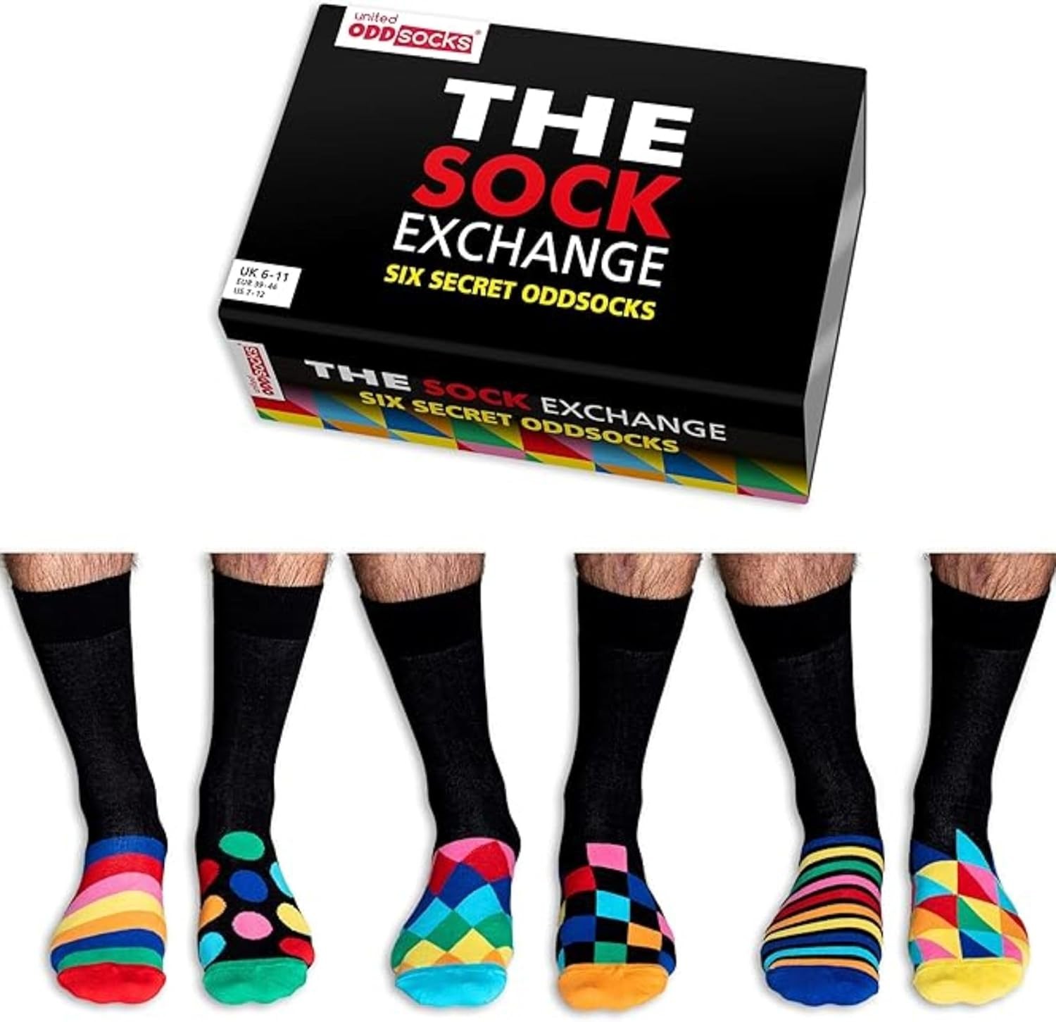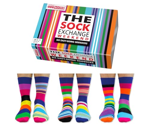 United Oddsocks The Sock Exchange Weekend Gift Box – 6 Colourful Easy-Going Mix & Match Odd Socks for Men – UK 6–11, EUR 39–46, US 7–12 – Fun Striped Novelty Socks Gift for Birthdays & Weekends