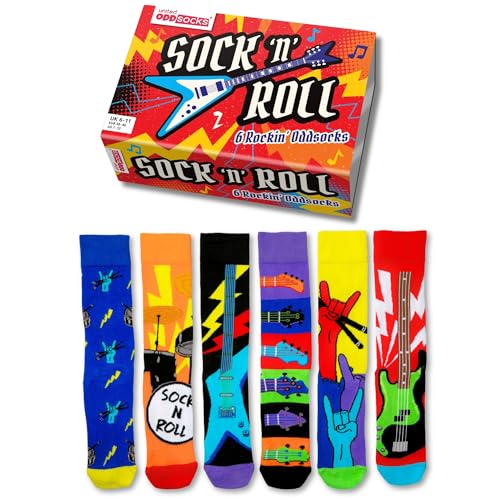 United Oddsocks Sock 'n' Roll Odd Socks Gift Box – 6 Colourful Rock Music-Themed Odd Socks for Men – UK 6–11, EUR 39–46, US 7–12 – Fun Cotton-Rich Socks in Guitar, Drums & Band Styles