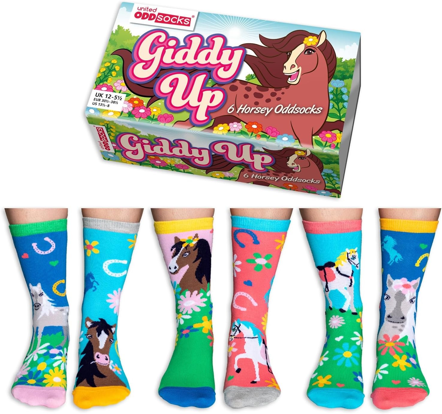 United Oddsocks Giddy Up Gift Box – 6 Horsey Calf-Length Odd Socks for Girls,