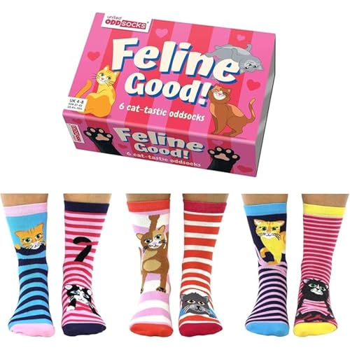 United Oddsocks - Feline Good - Box of 6 Odd Socks for Ladies - UK 4-8 EUR 37-42