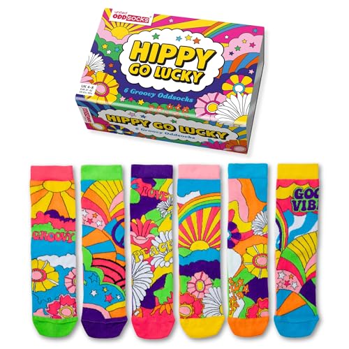 United Oddsocks Hippy Go Lucky Gift Box – 6 Groovy Mix & Match Odd Socks for Women – UK 4–8, EUR 37–42, US 6.5–10.5 – Colourful Festival-Inspired Fun Gift for Birthdays, Christmas & Mother’s Day
