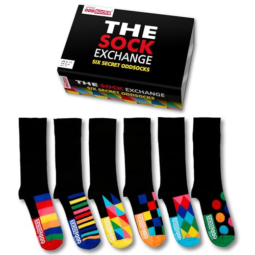 United Oddsocks The Sock Exchange Men's Odd Socks Gift Box – 6 Black Socks with Colourful Patterned Soles for Men, UK 6-11, EUR 39-46, US 7-12, Fun Business Mix & Match Socks Gift for Work, Birthdays