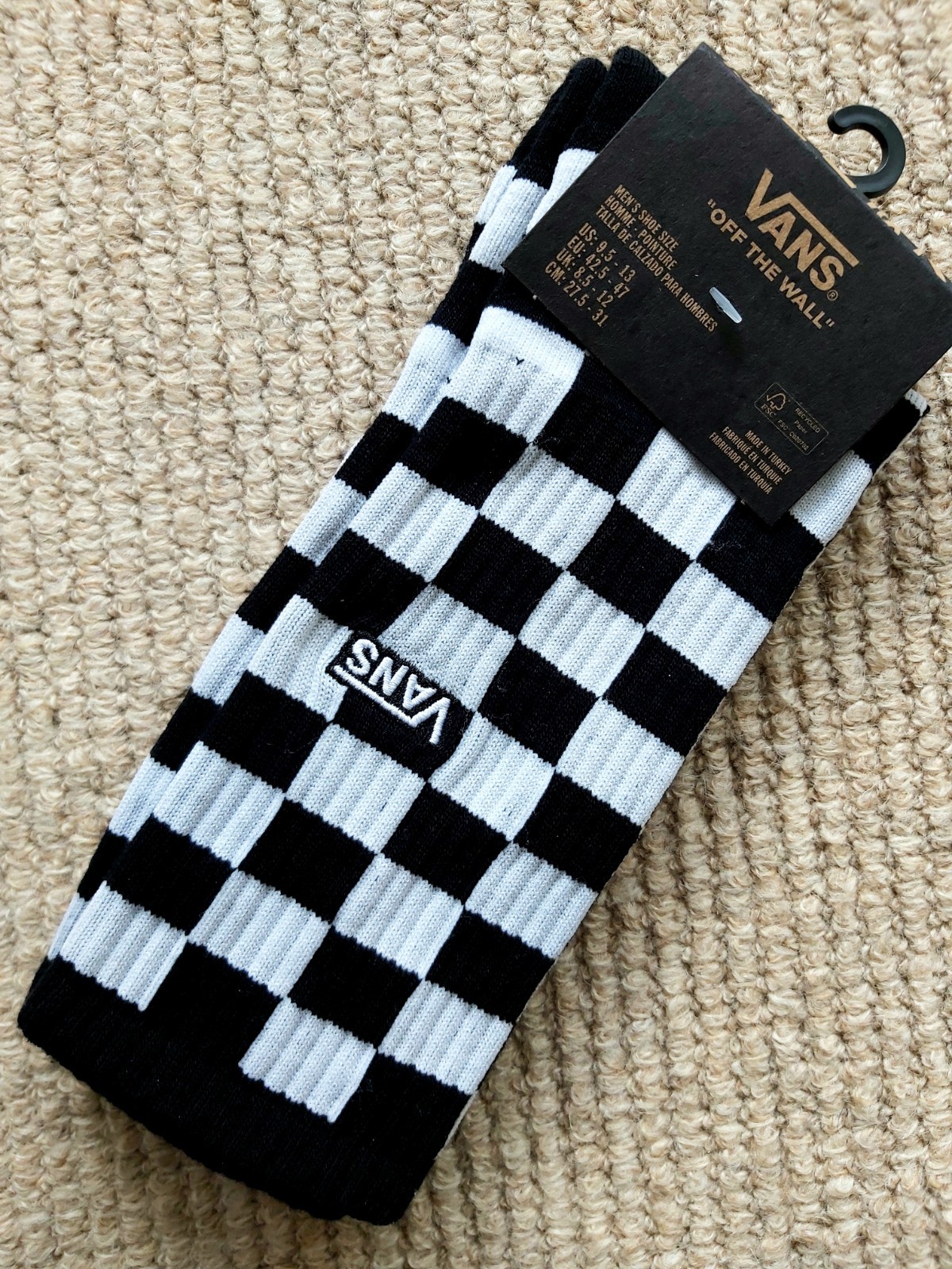 VANS UK 8.5-12 (Eu 42-47) Blac White Check OFF THE WALL Ribbed Crew Socks Adult