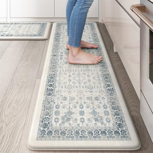 Sungea Anti Fatigue Kitchen Mat, Non Slip Cushioned Kitchen Floor Mats Waterproof Kitchen Rugs Sets of 2, Distressed Thick Comfort Standing Desk Mat for Office Laundry Sink(Blue)