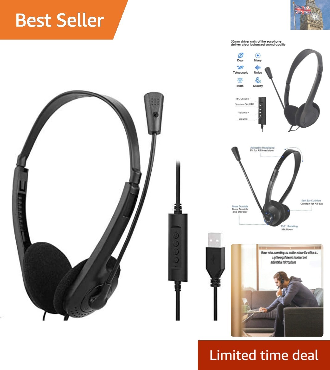 Comfortable USB Headset with Noise Cancelling Mic for Office & Learning