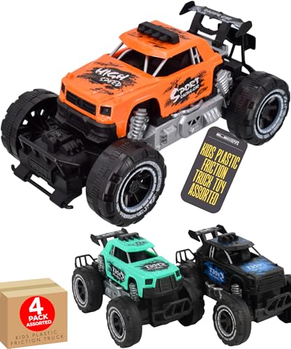 Electoys - Friction Powered Toy Buggy Off-Road Racing Car for Kids Colourful Plastic Vehicle for Indoor Outdoor Play Dynamic Push and Go Action Durable Design Gift for Children - 4 Pack